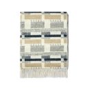 Woven from 100% Merino wool. the Brick Weave Throw features a bold geometric pattern of interlocking blocks in soft taupe. slate grey and deep navy on a warm cream background. Finished with delicate fringed edges. it brings warmth. texture and colour to any space.