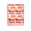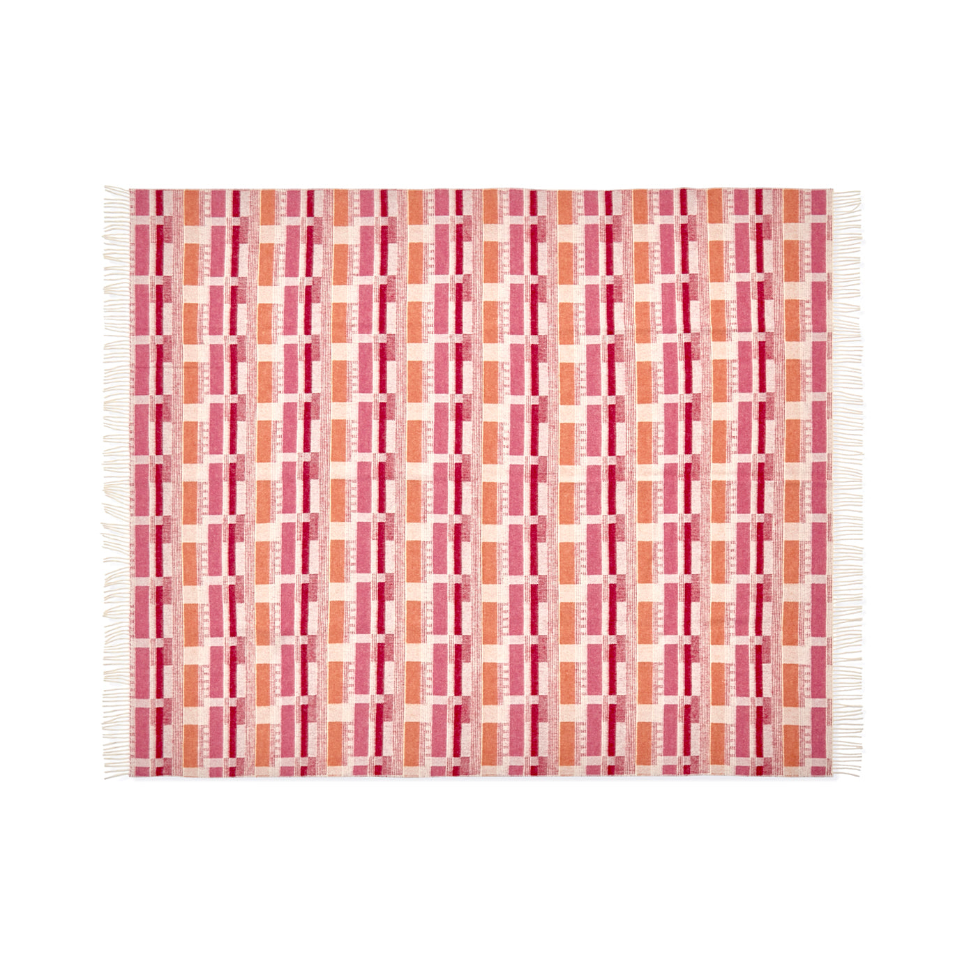 Woven from 100% Merino wool. the Brick Weave Throw features a bold geometric pattern of interlocking blocks in coral. blush and berry on a soft cream background. Finished with delicate fringed edges. it brings warmth. texture and colour to any space.