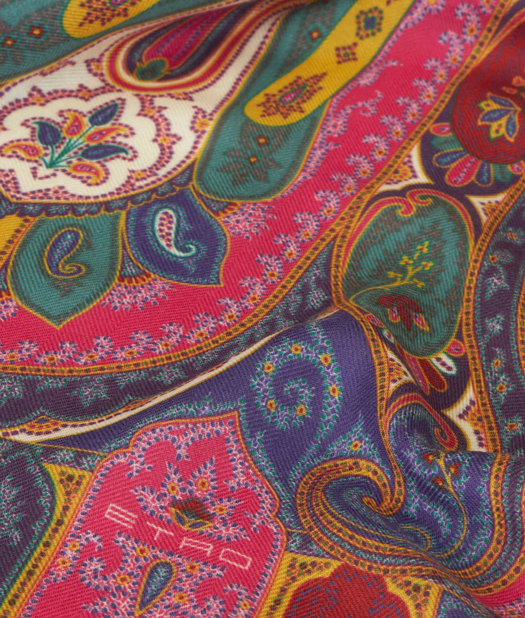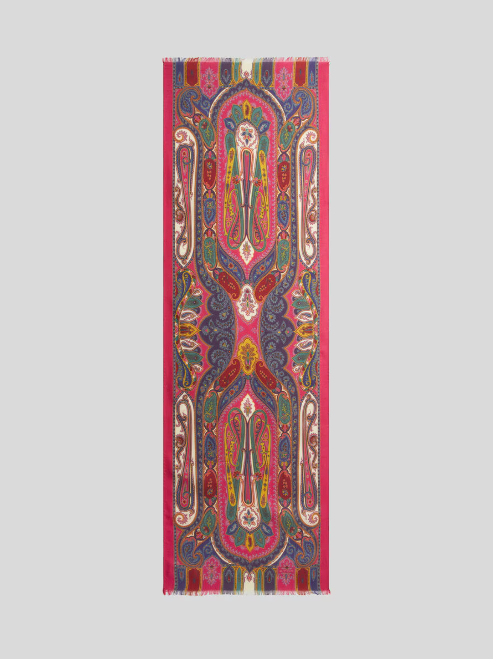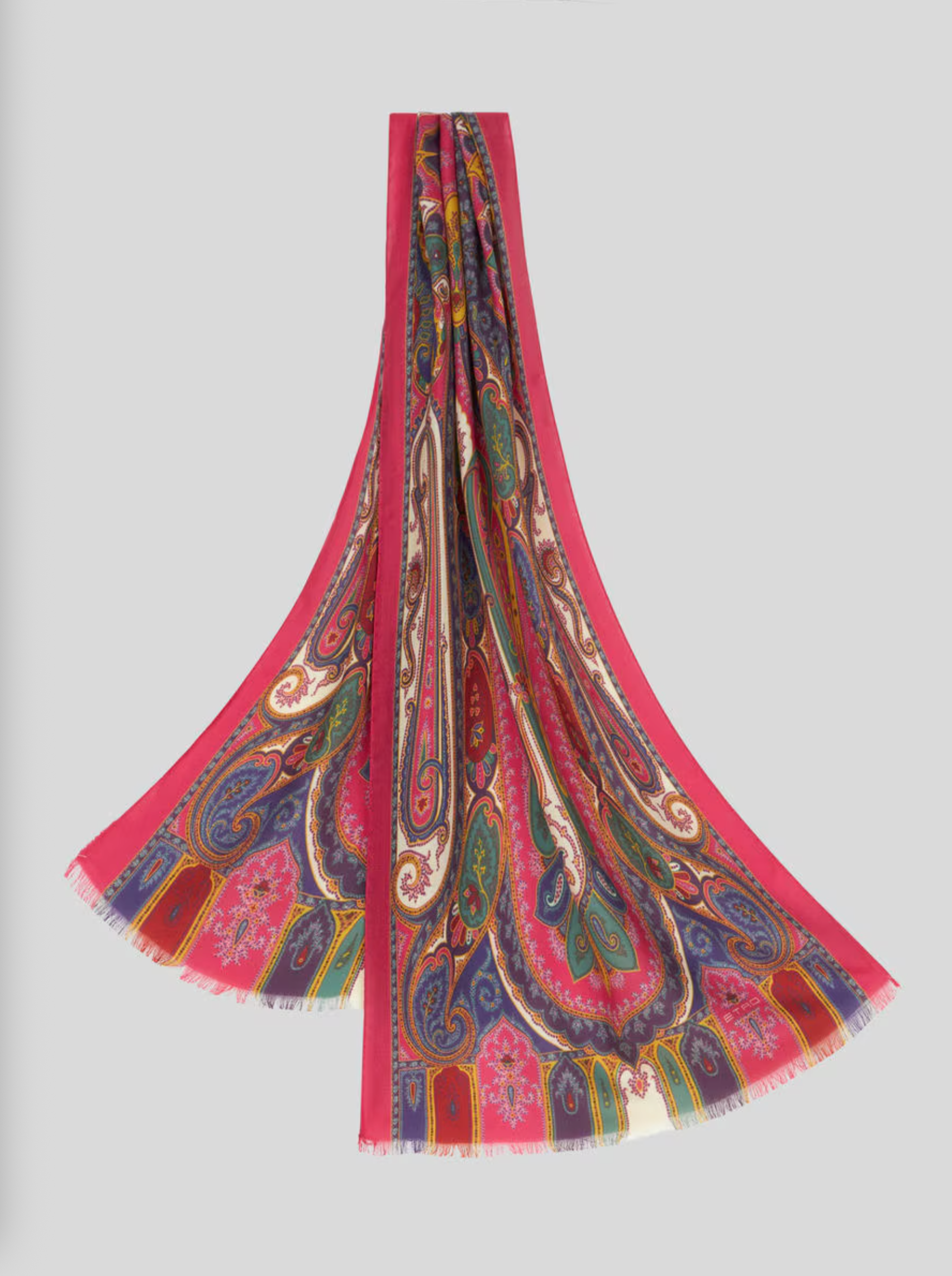 Cashmere and silk scarf with decorative Paisley print. This accessory features small fringes at the hems.