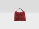 Reversible faux fur shoulder bag with rope handles and a contrasting and removable shoulder strap. One side in deep burgundy faux-fur and the other in tan faux leather.