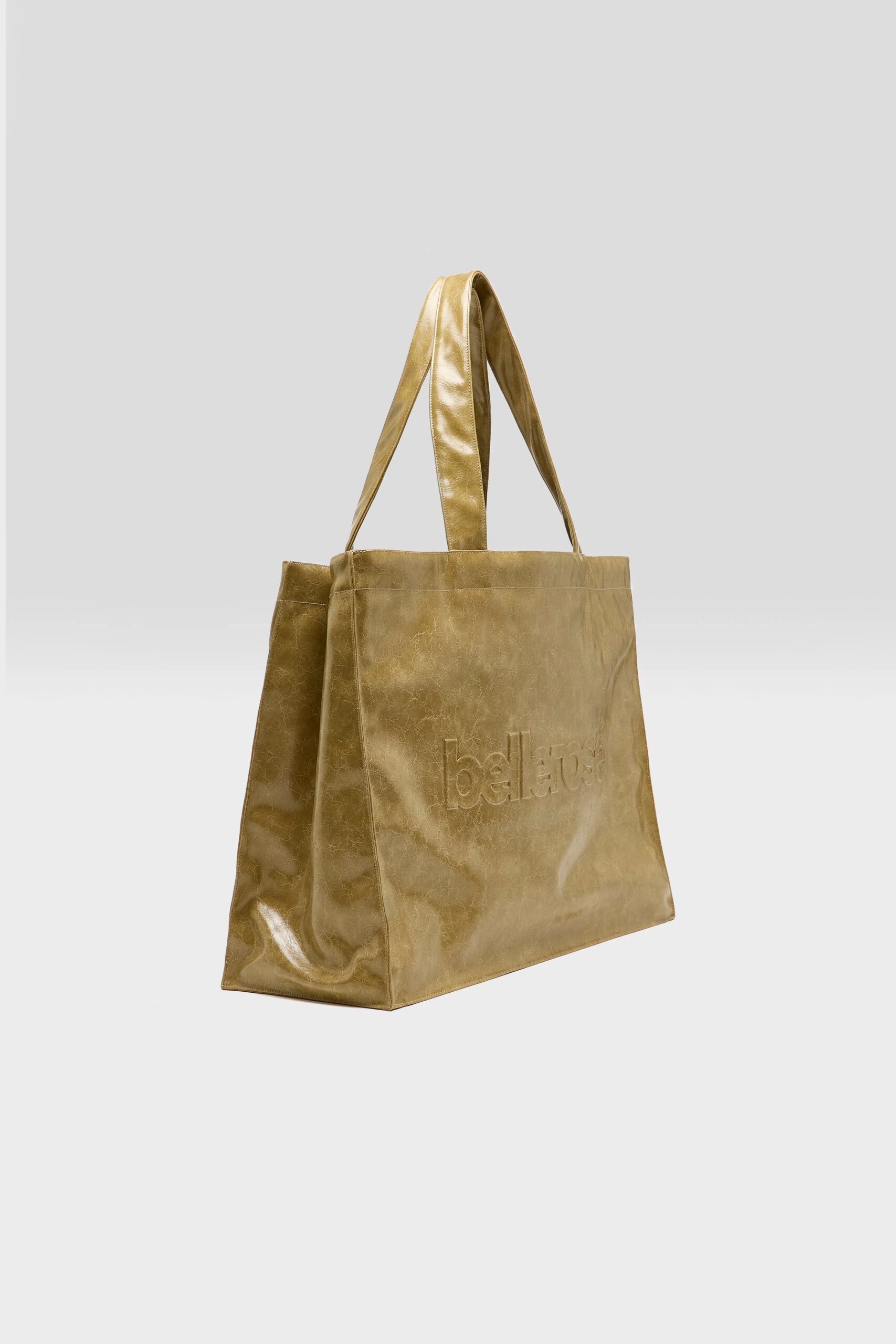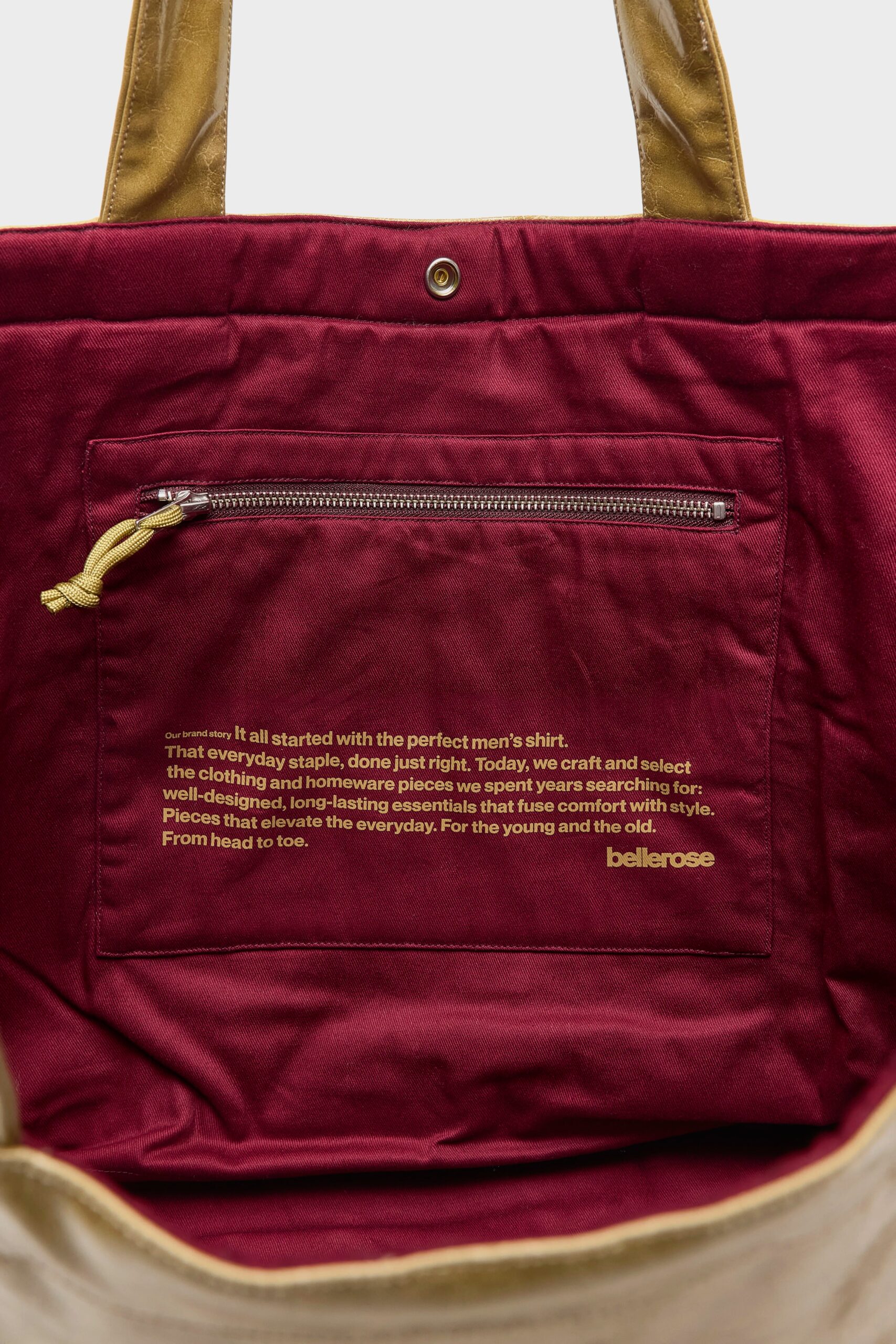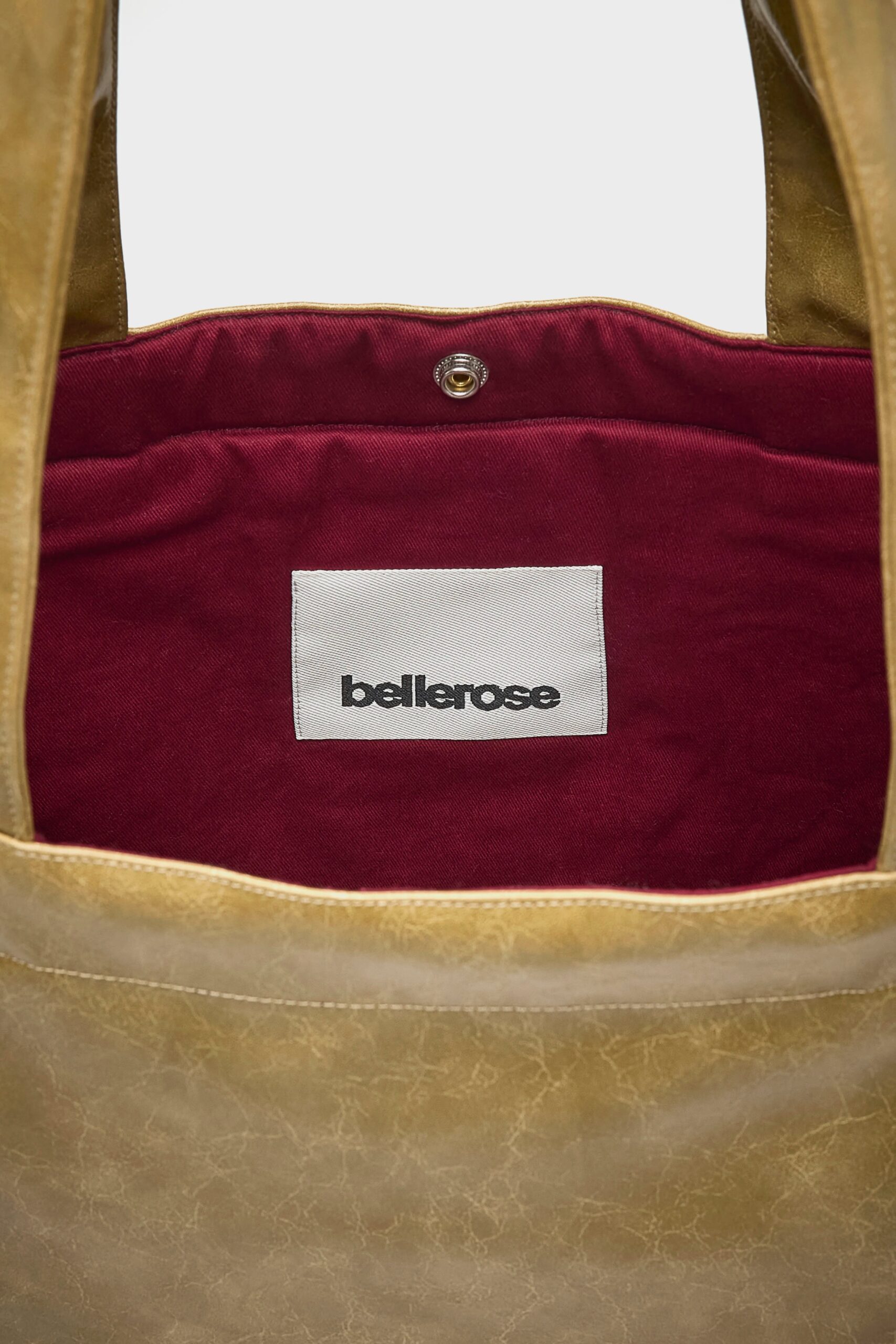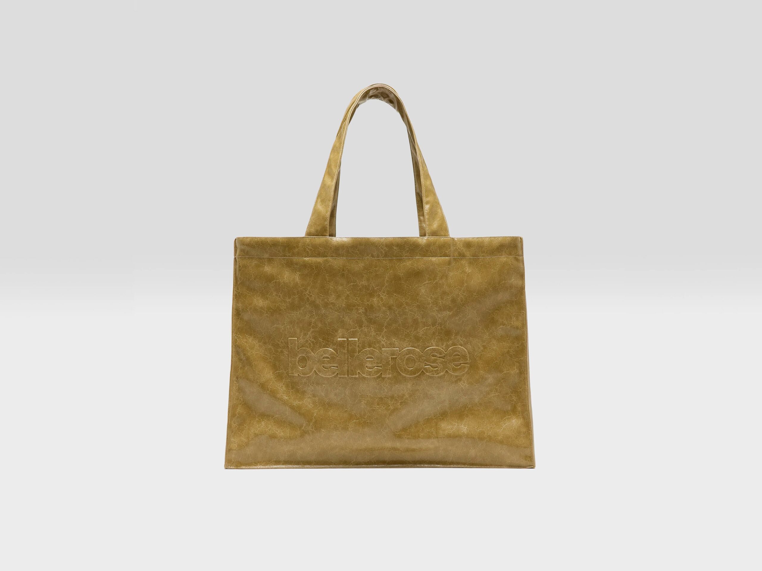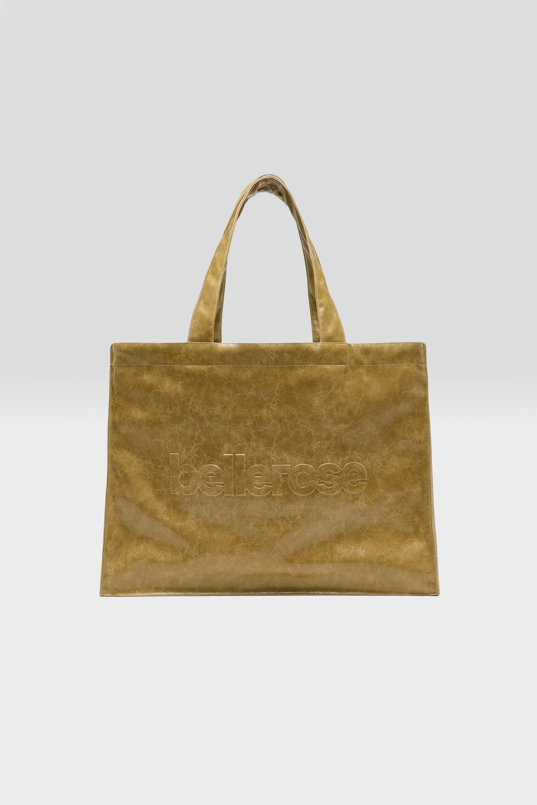 Large shopping bag in dark beige crackled patent faux-leather. lined with burgundy fabric. and featuring an embossed ‘bellerose’ logo.