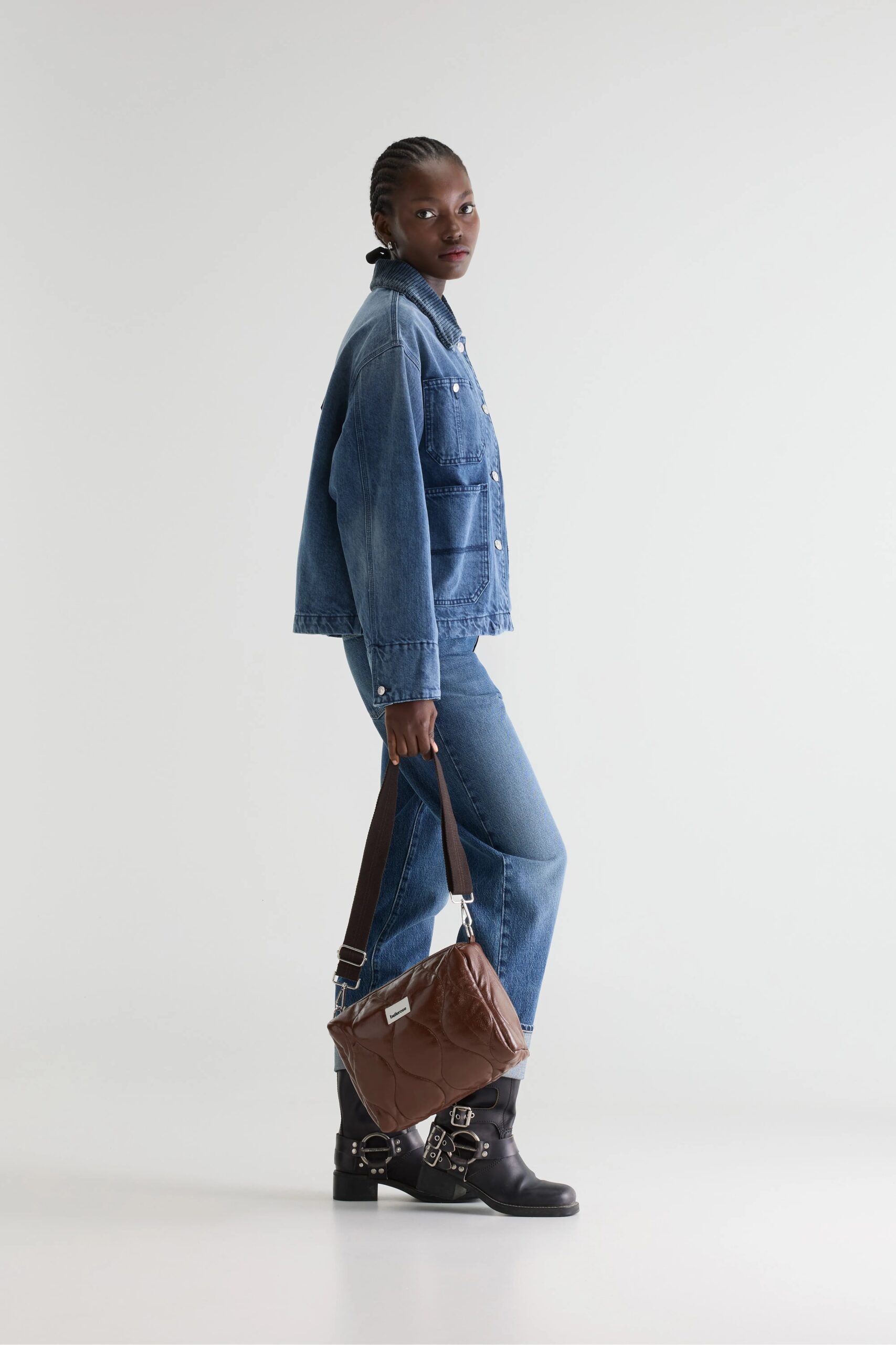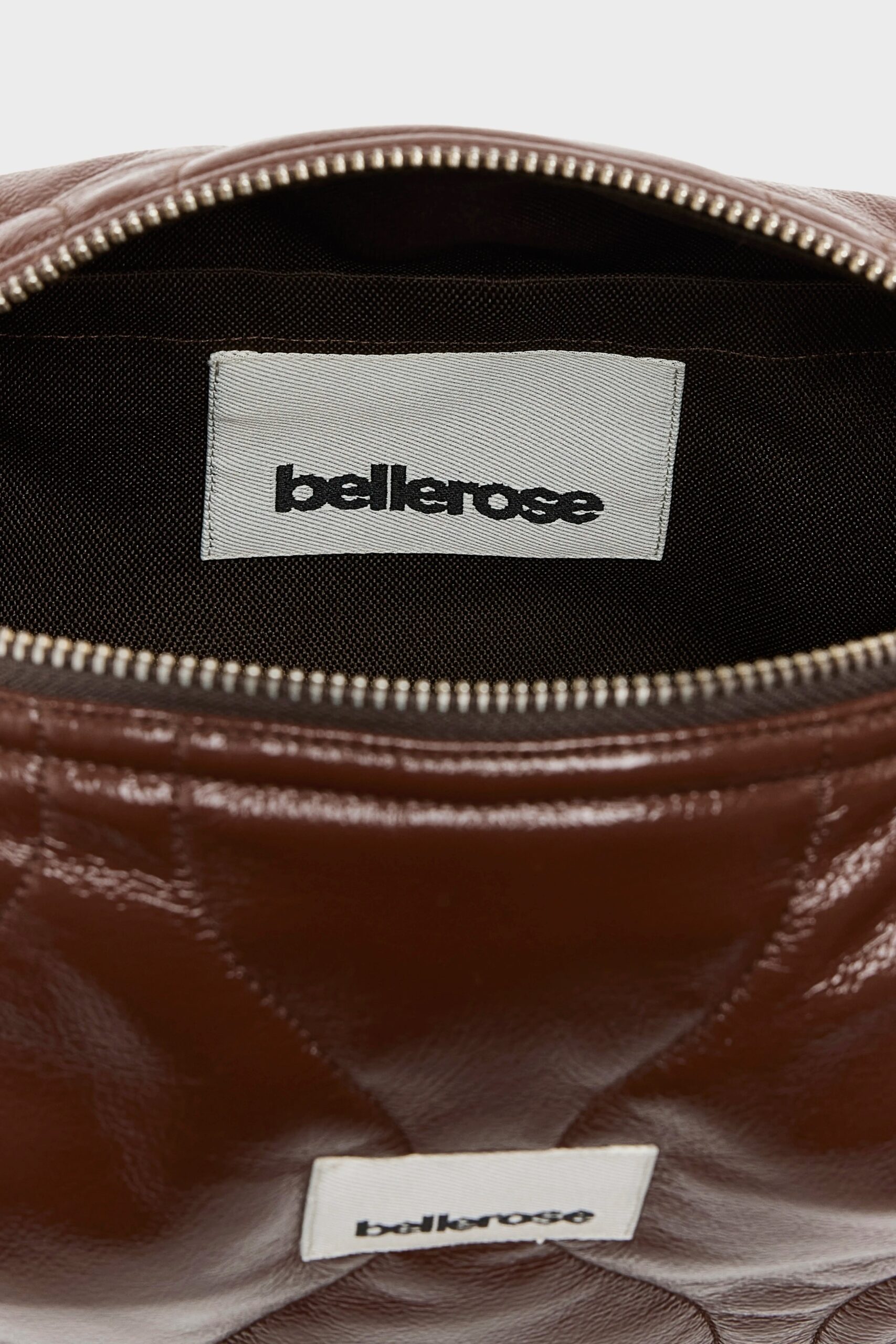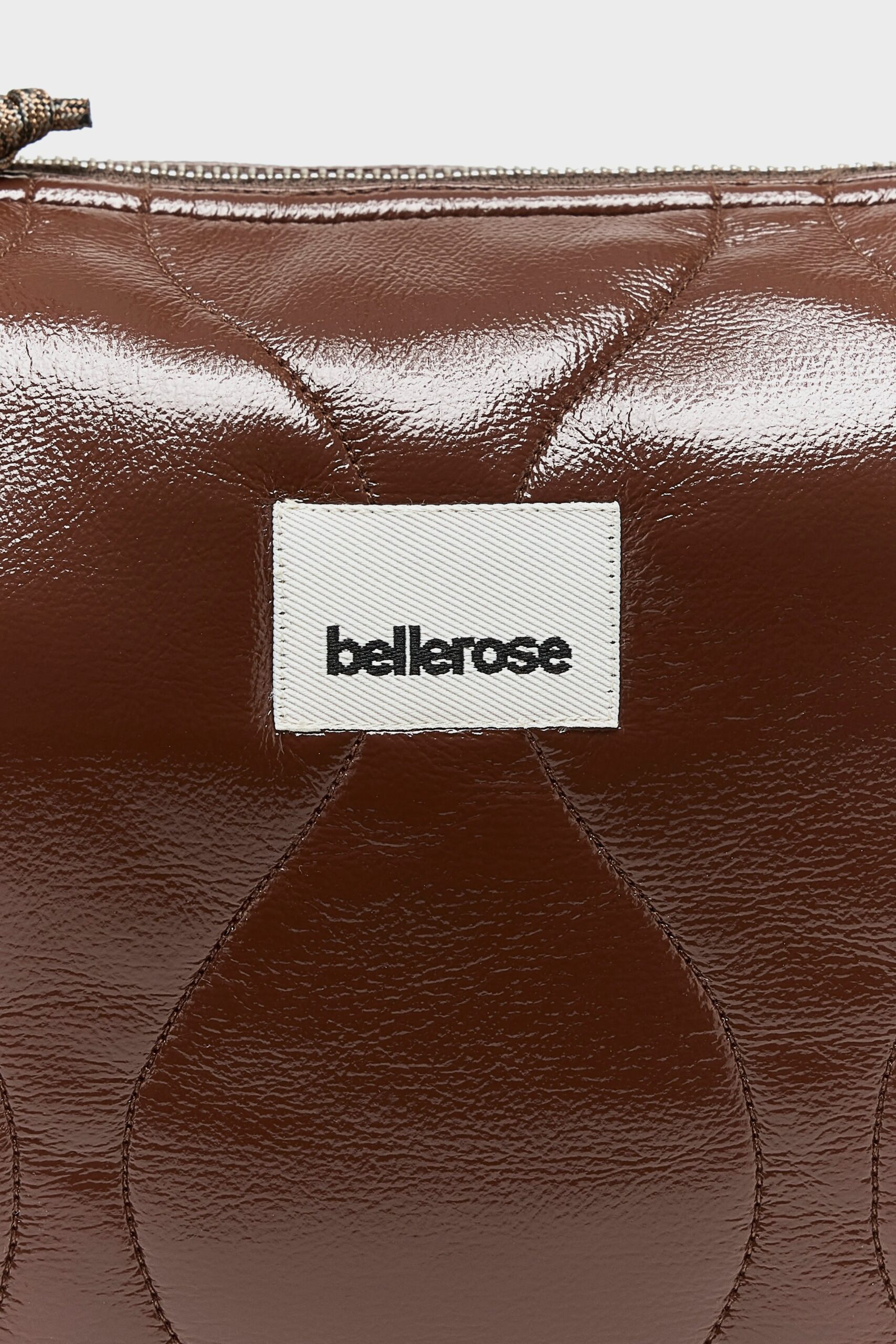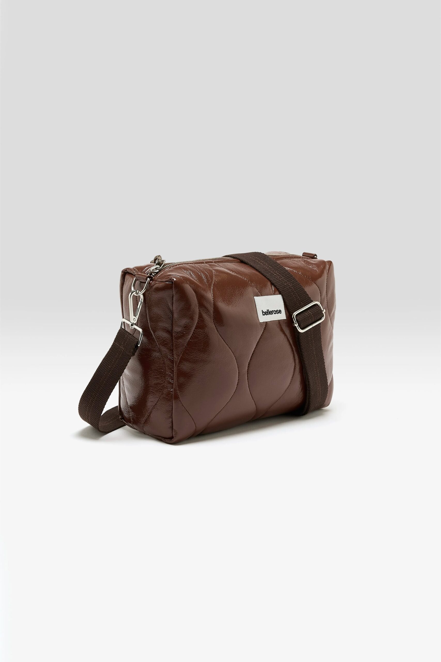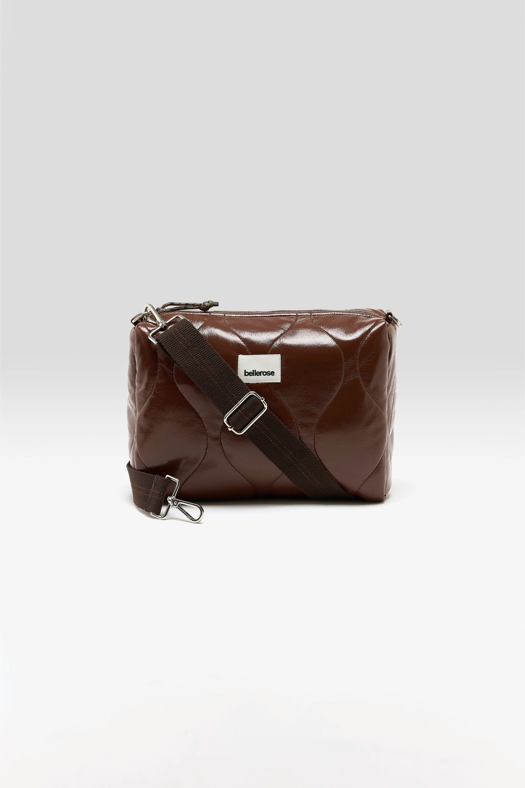 Zip-top crossbody bag in glossy quilted vinyl-like fabric in a dark coffee brown.