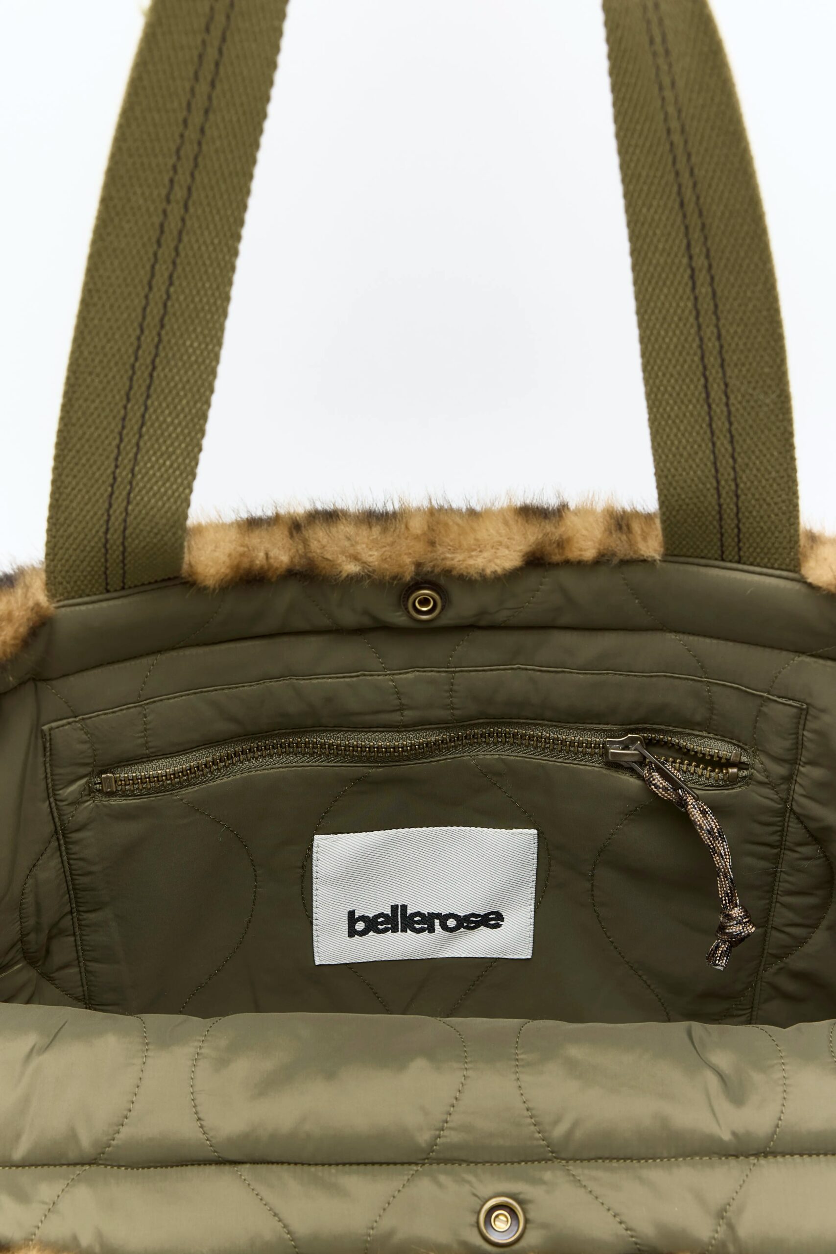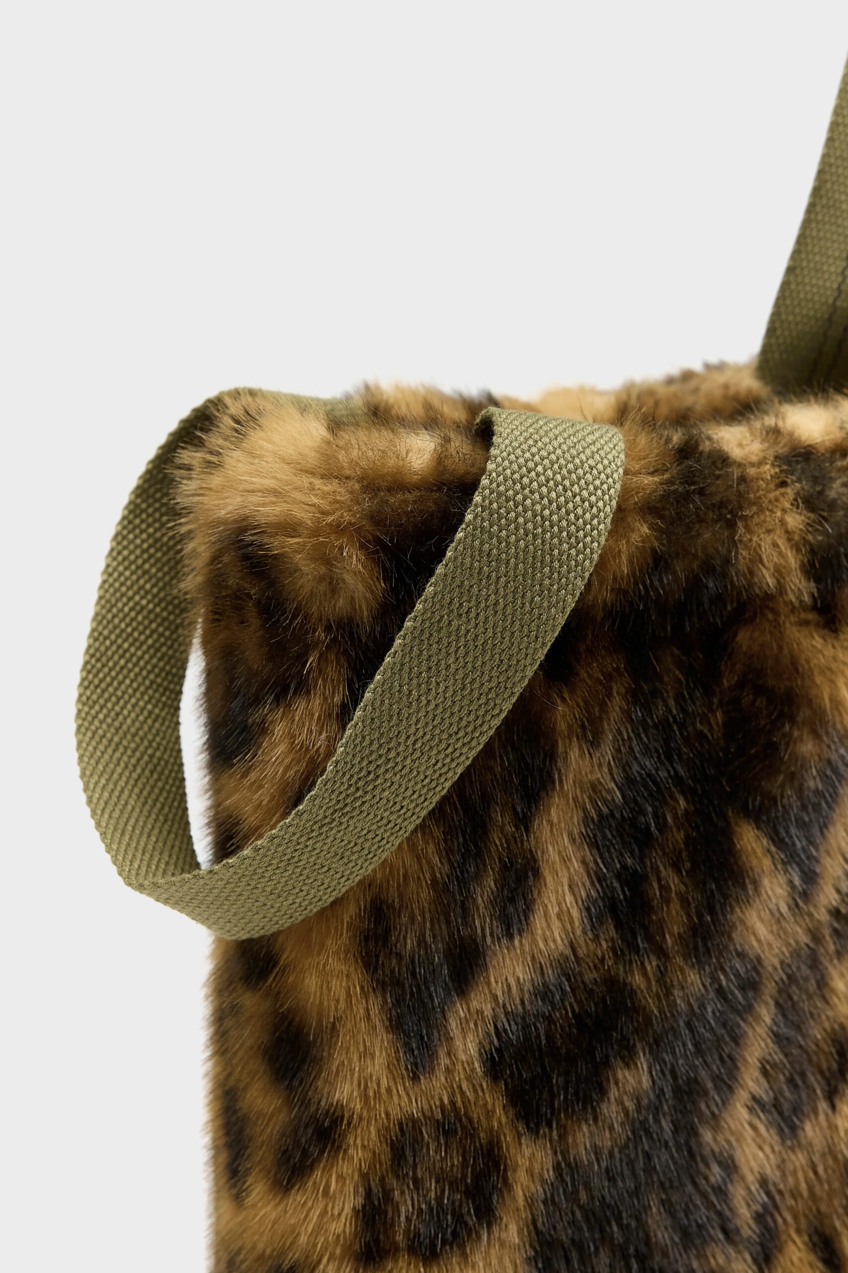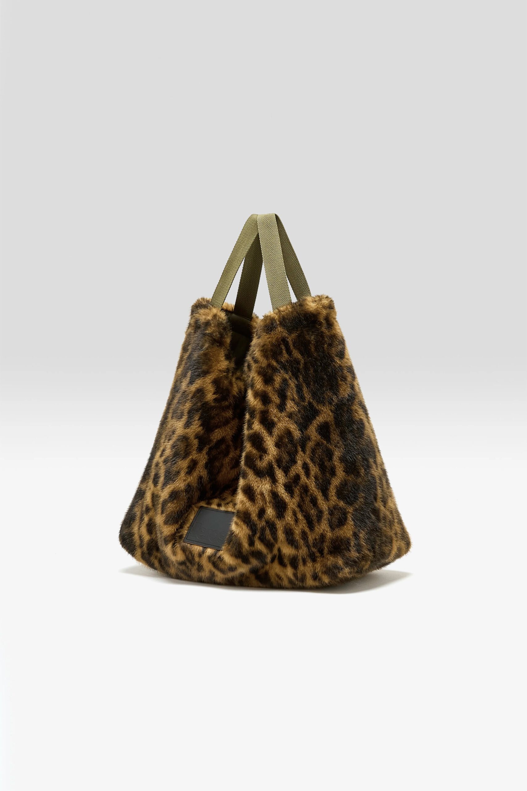 Leopard-print teddy handbag featuring dual handles. beige ripstop lining. and an interior zip pocket.