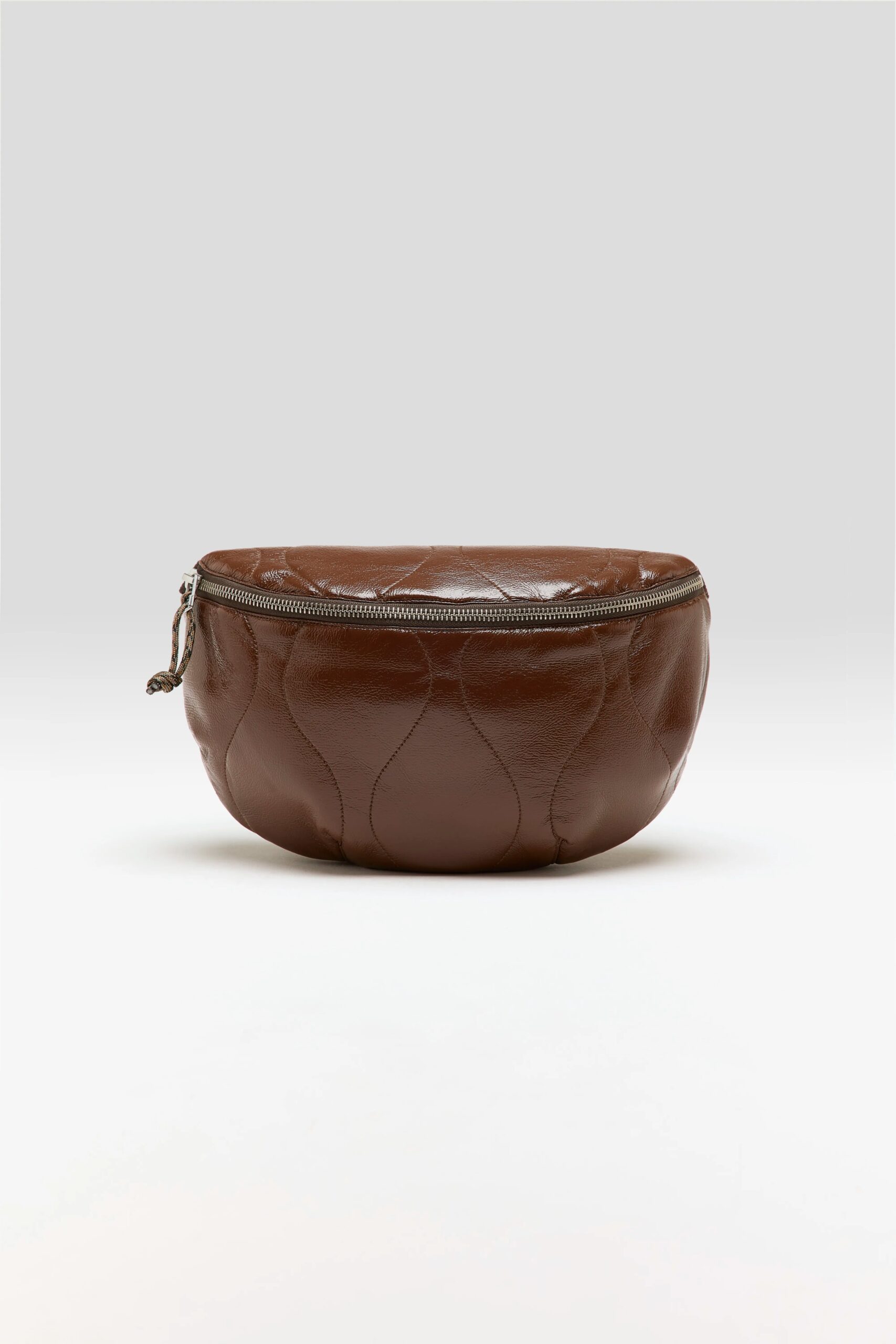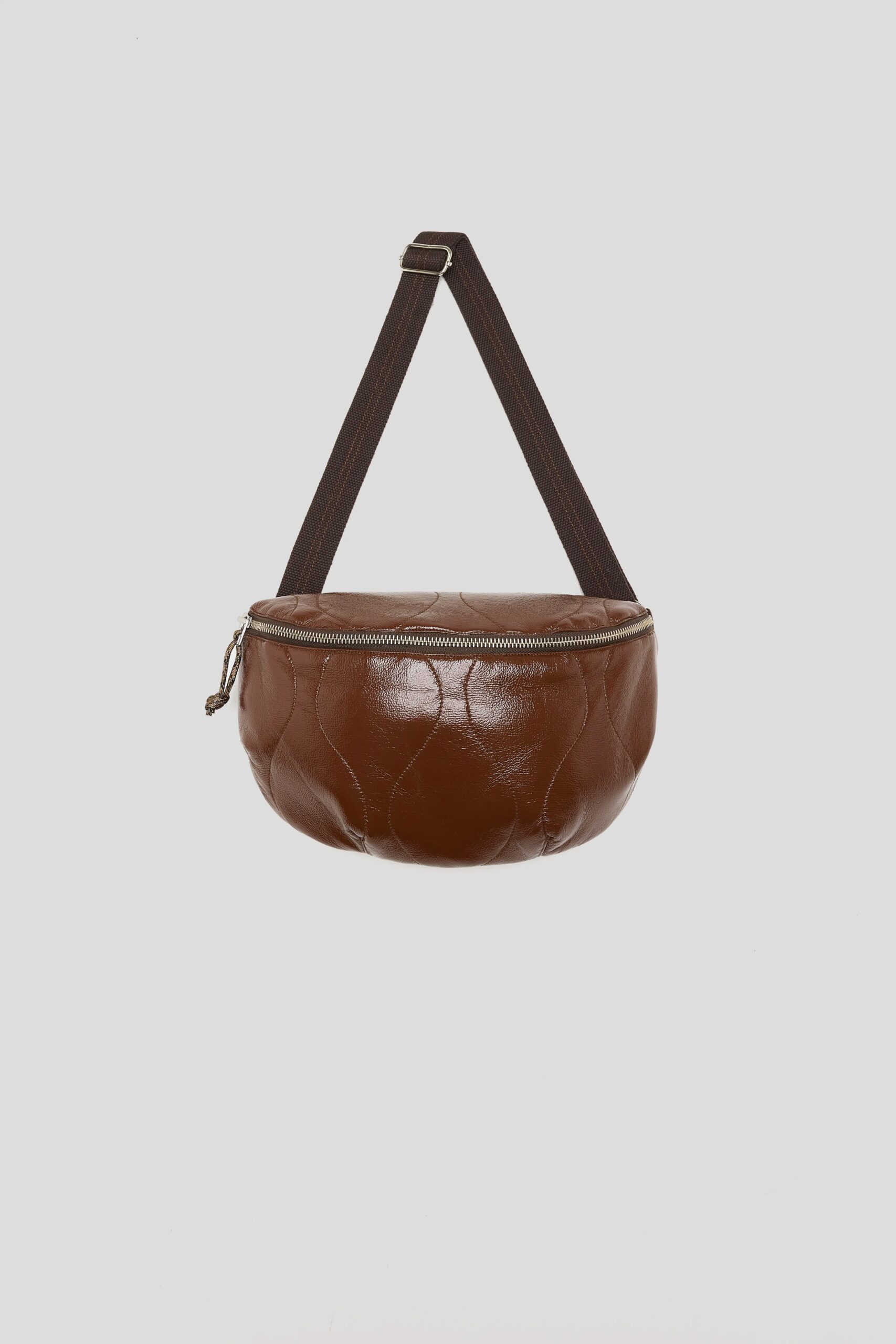 Zip-front sling bag in coffee brown glossy faux-leather with a wavy pattern.