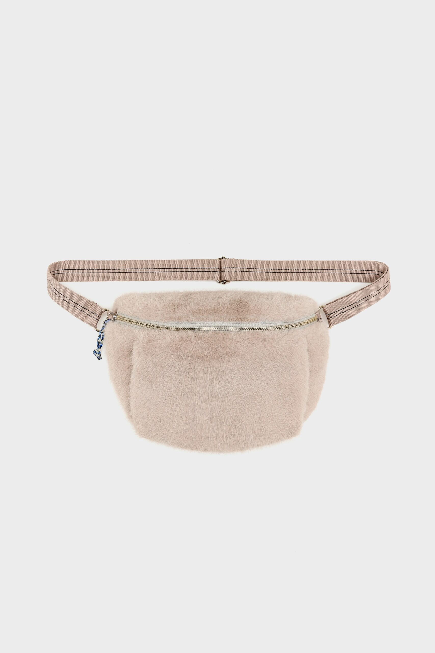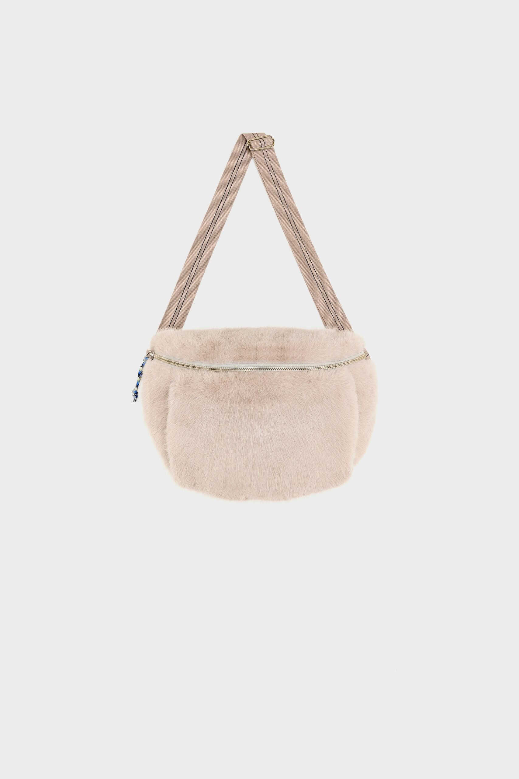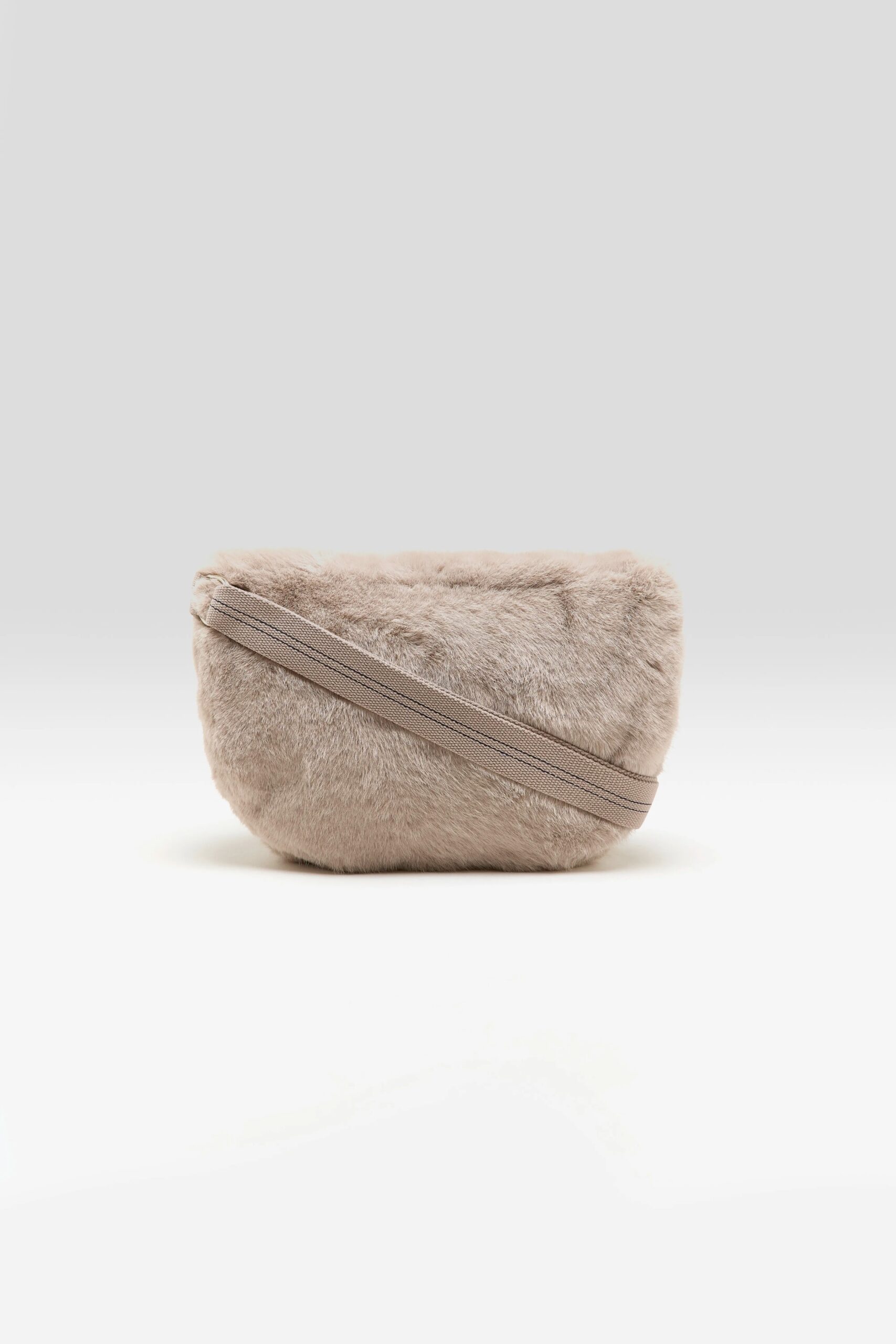 Light grey-beige faux fur sling bag with a hand-warming pocket and a Bellerose front tab.