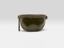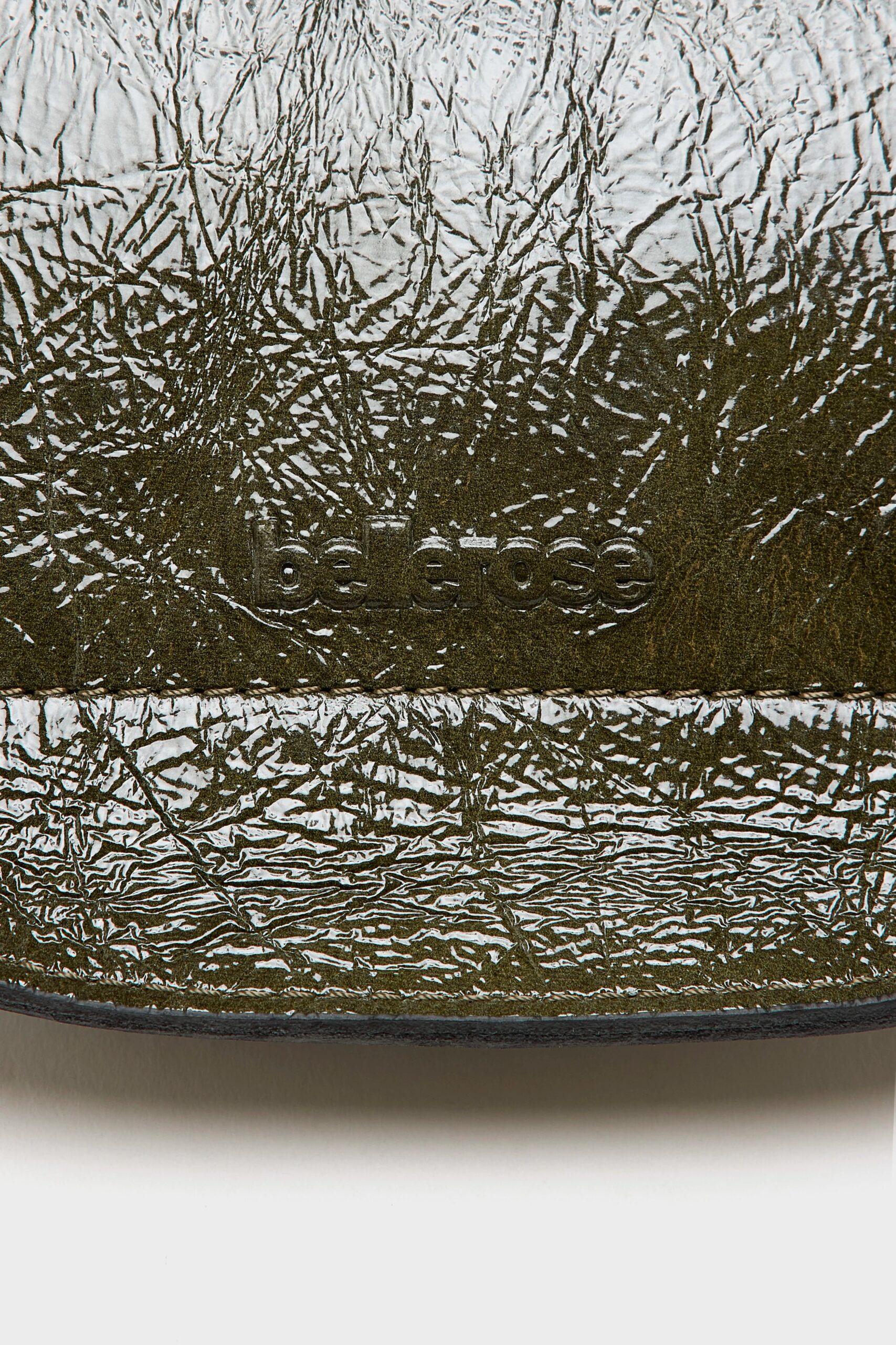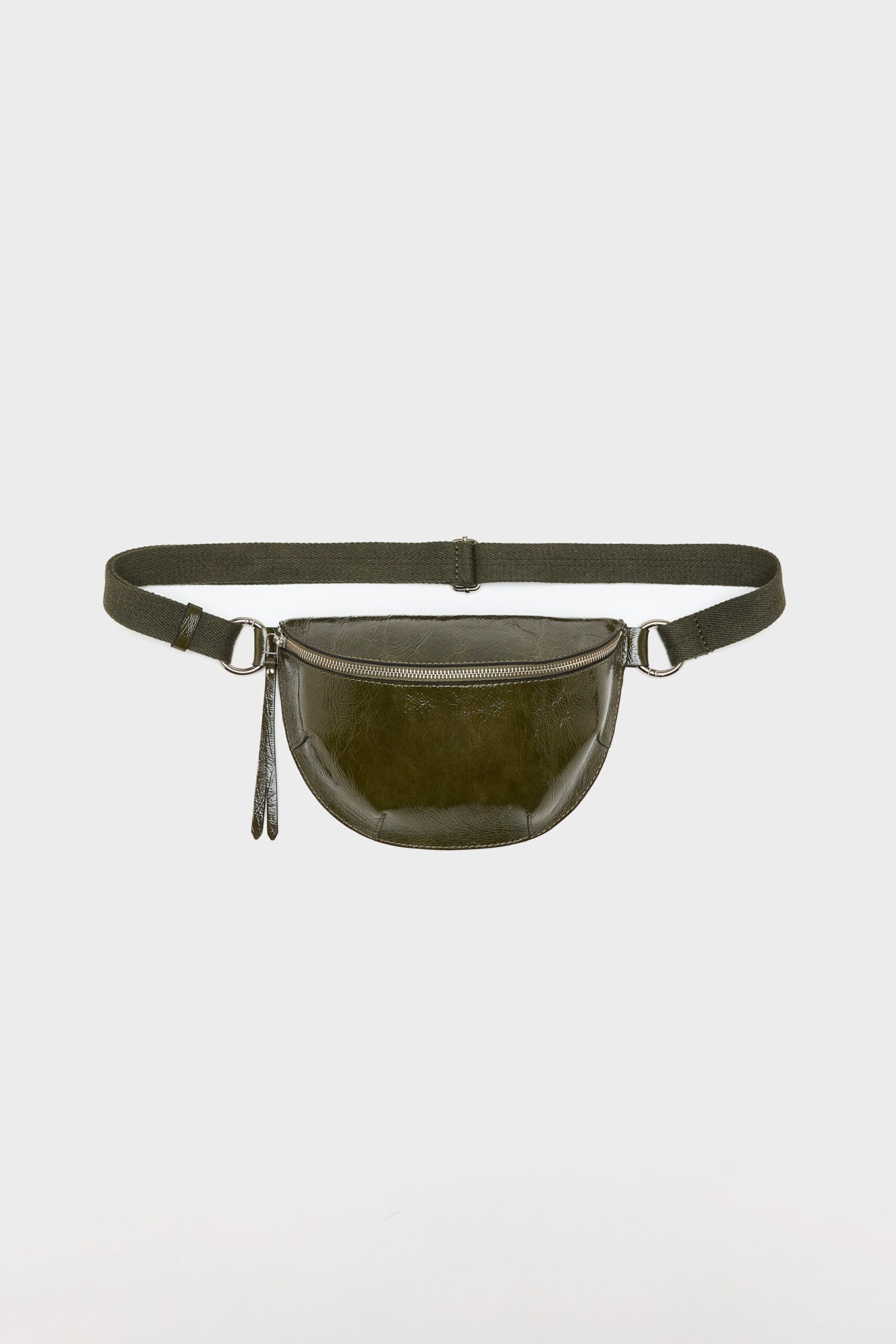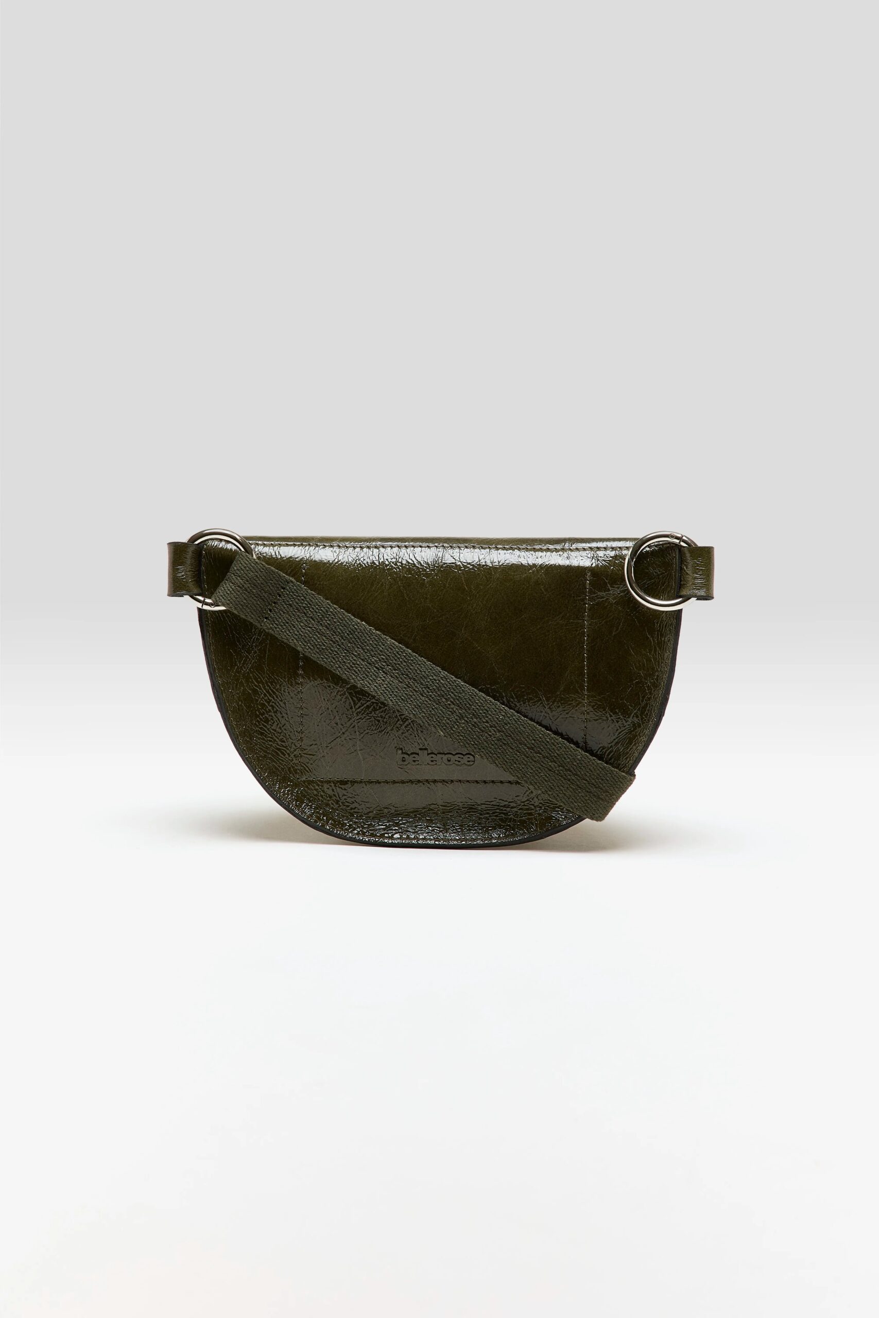 Half moon shaped sling-bag in crinkled glossy dark green leather.