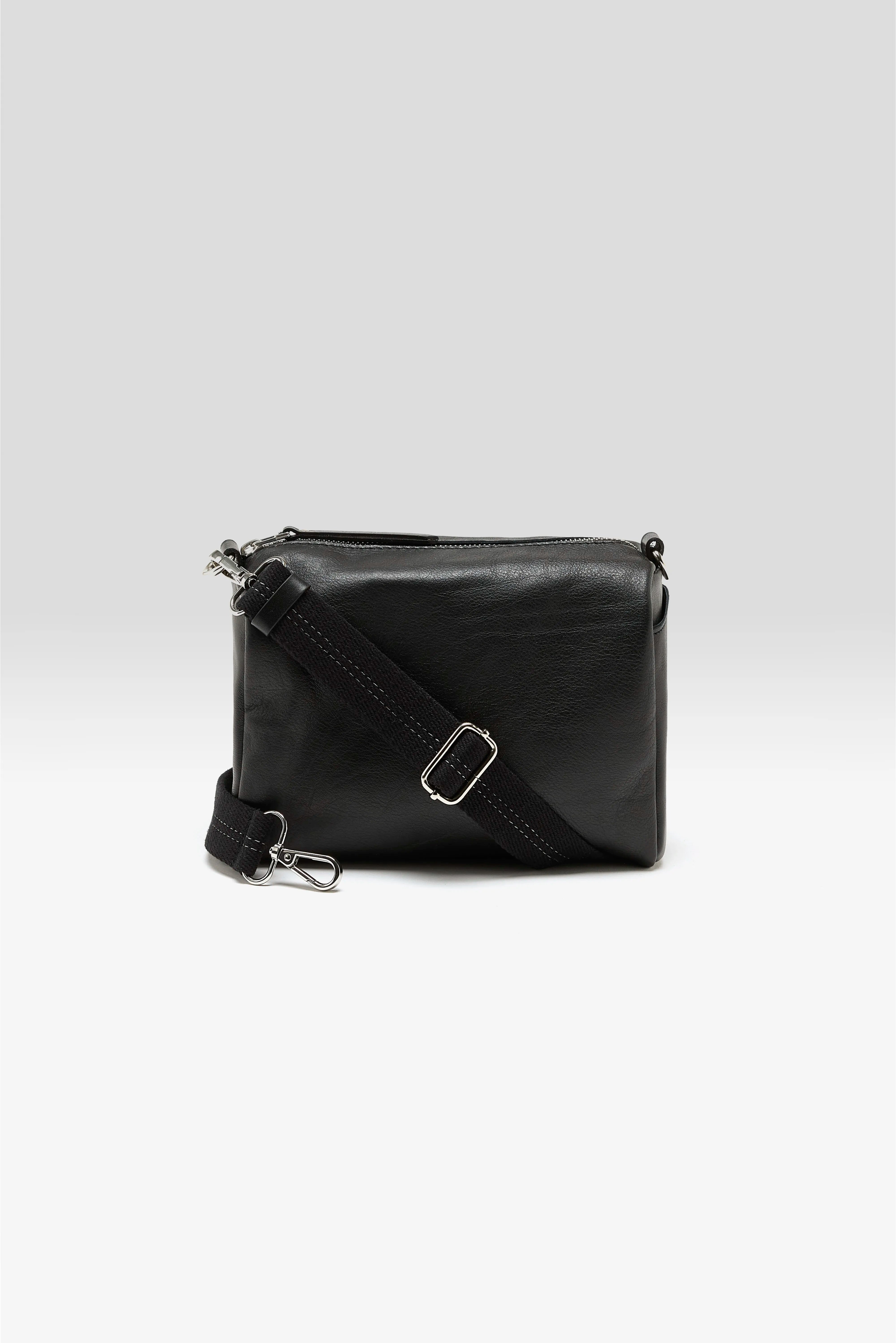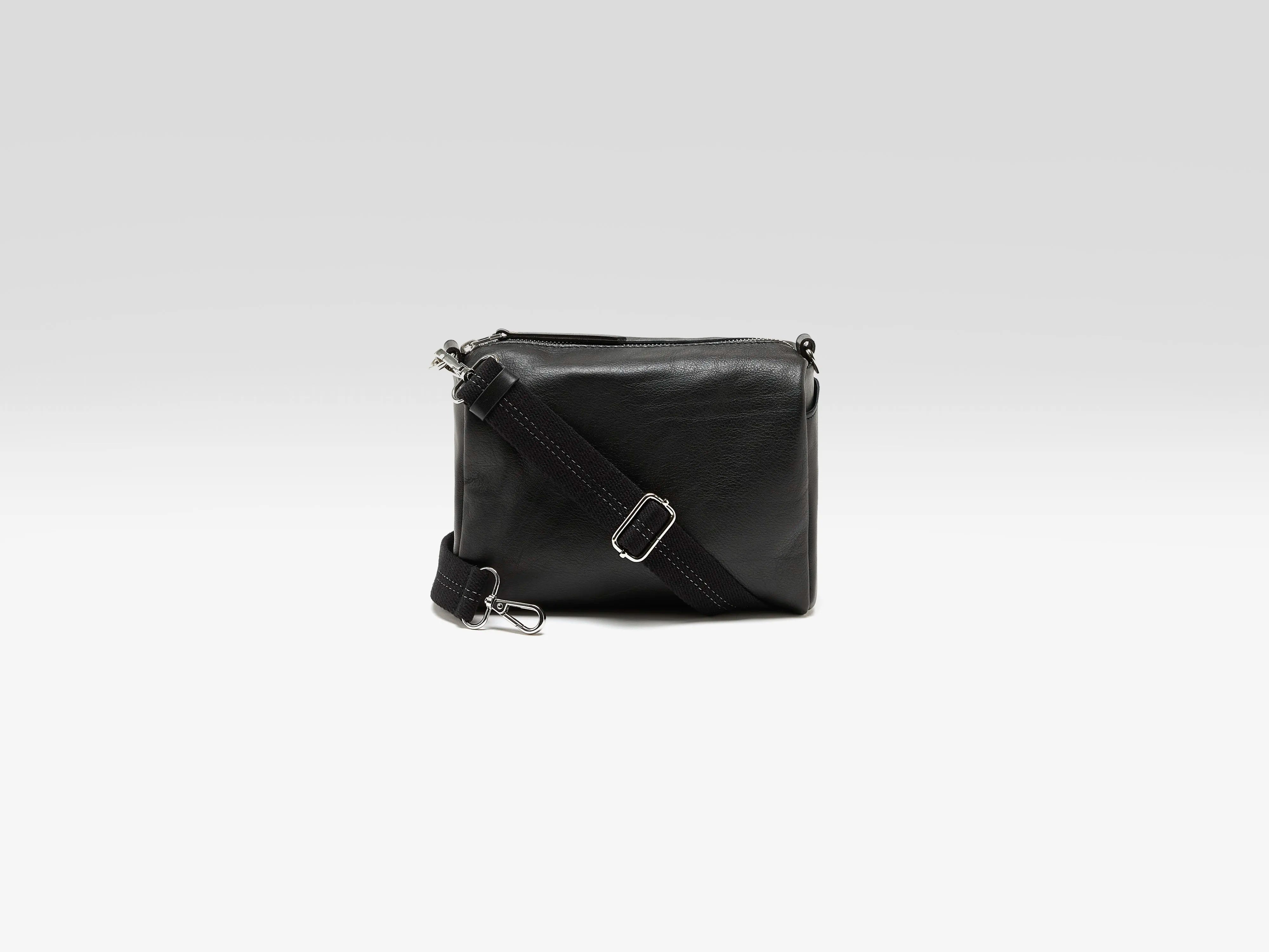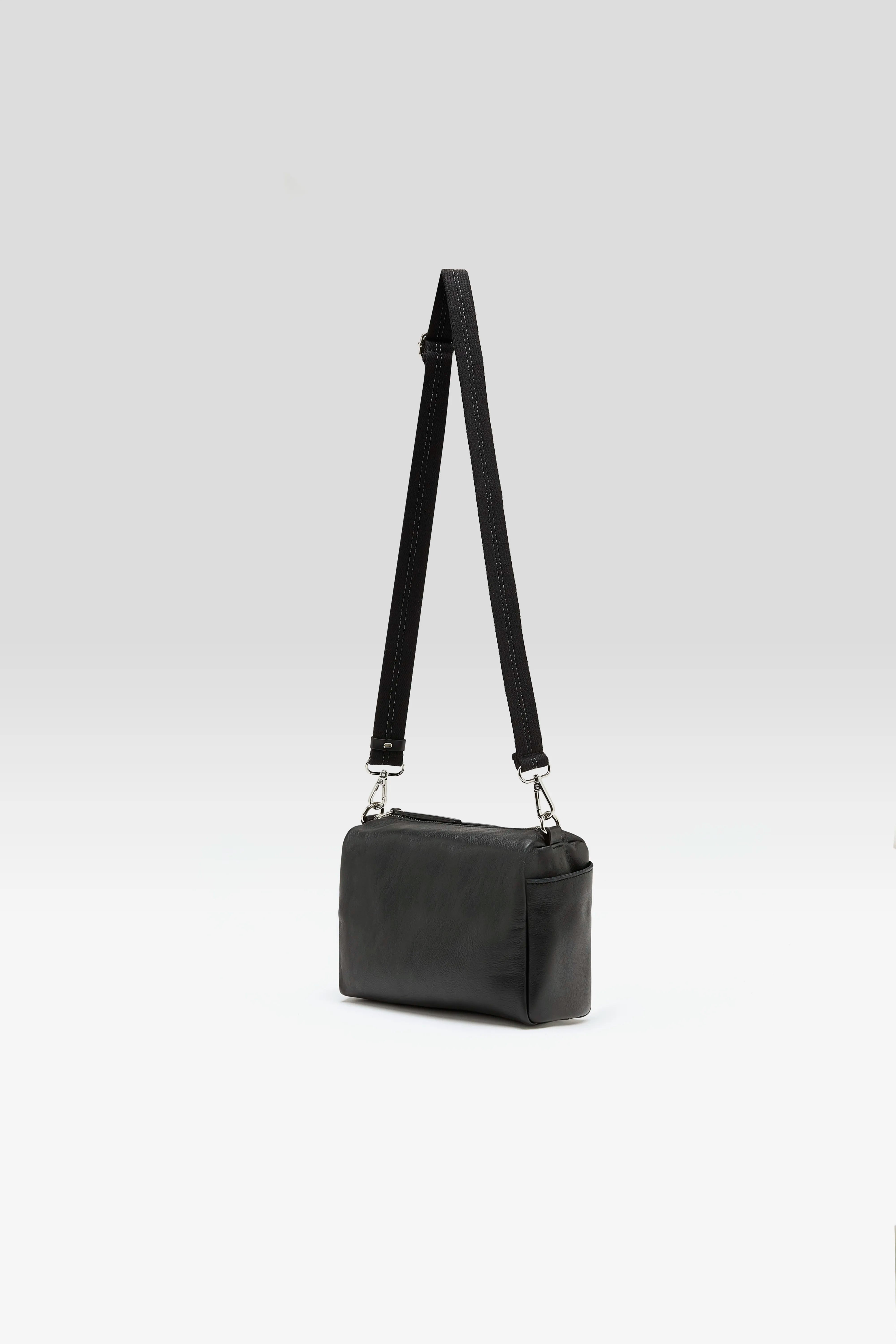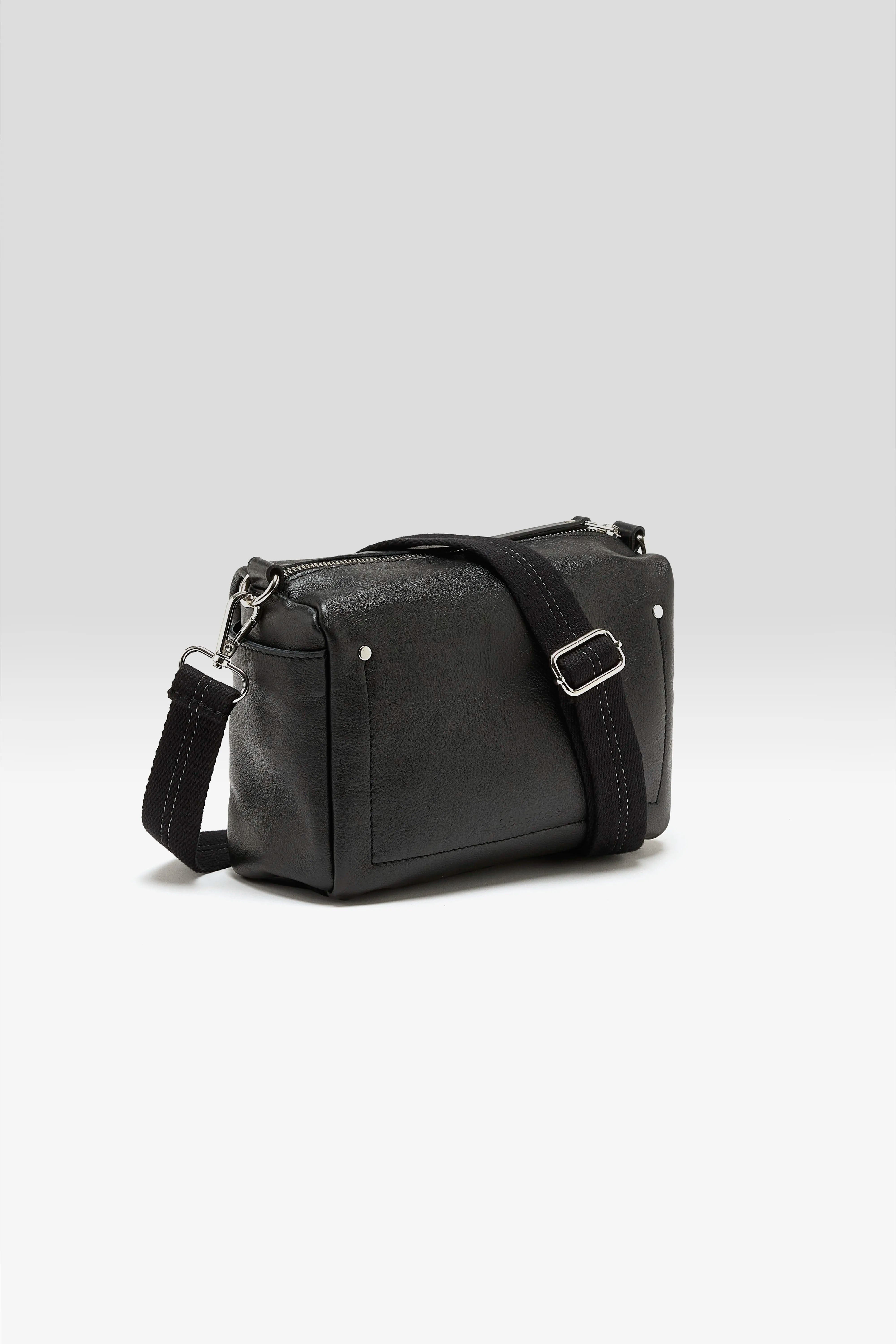 Supple box bag with zip top closure and side pocket made from grainy black leather.
