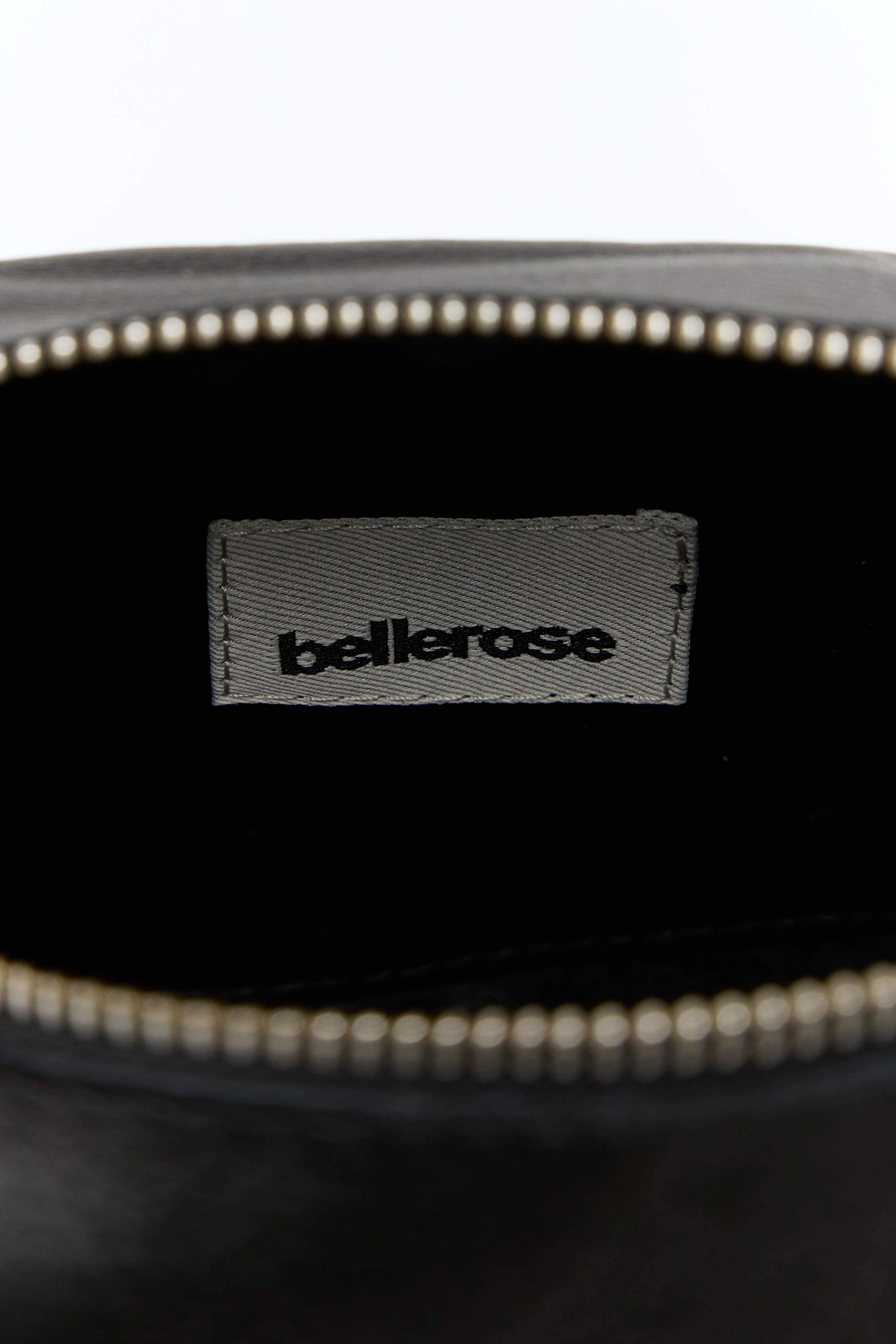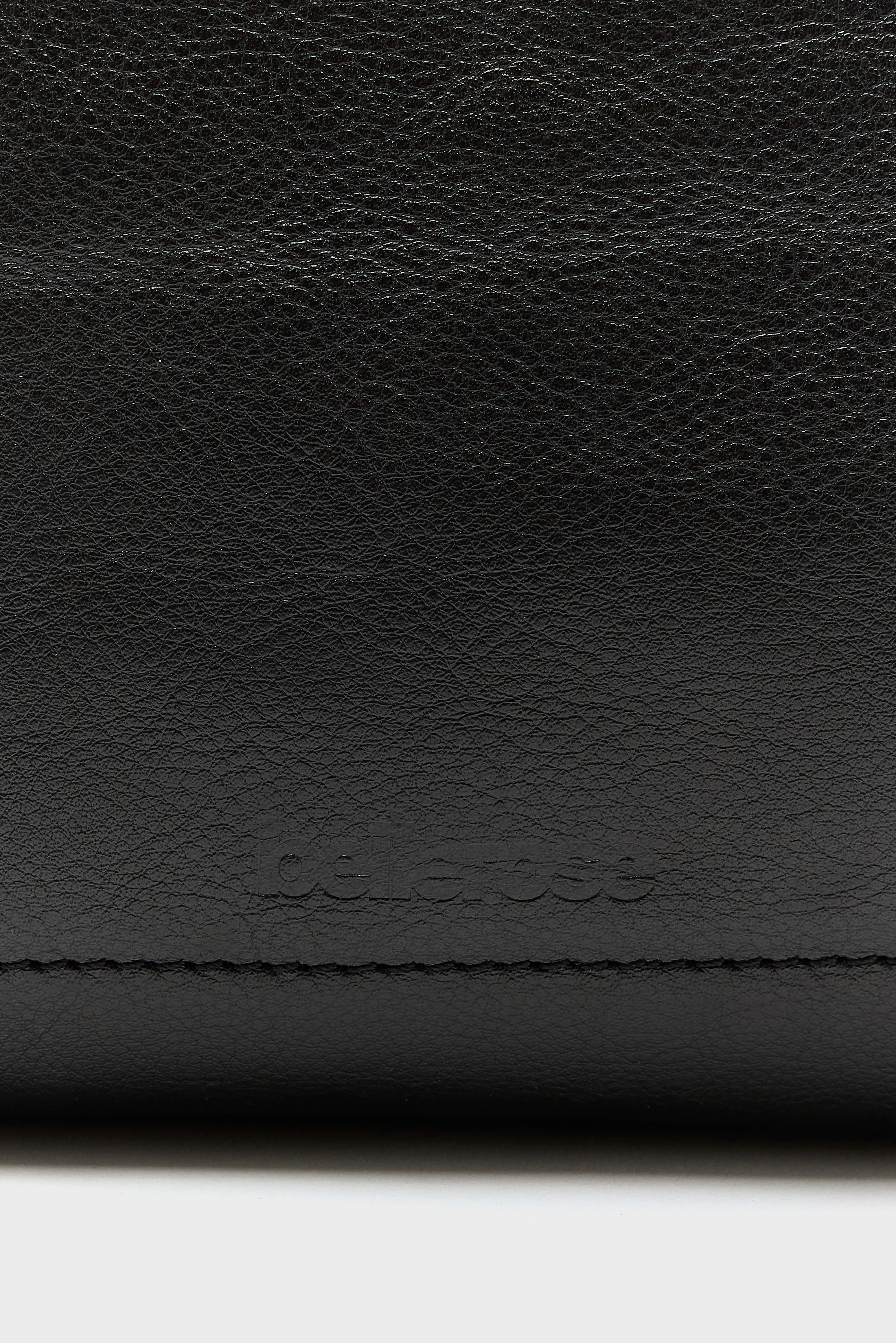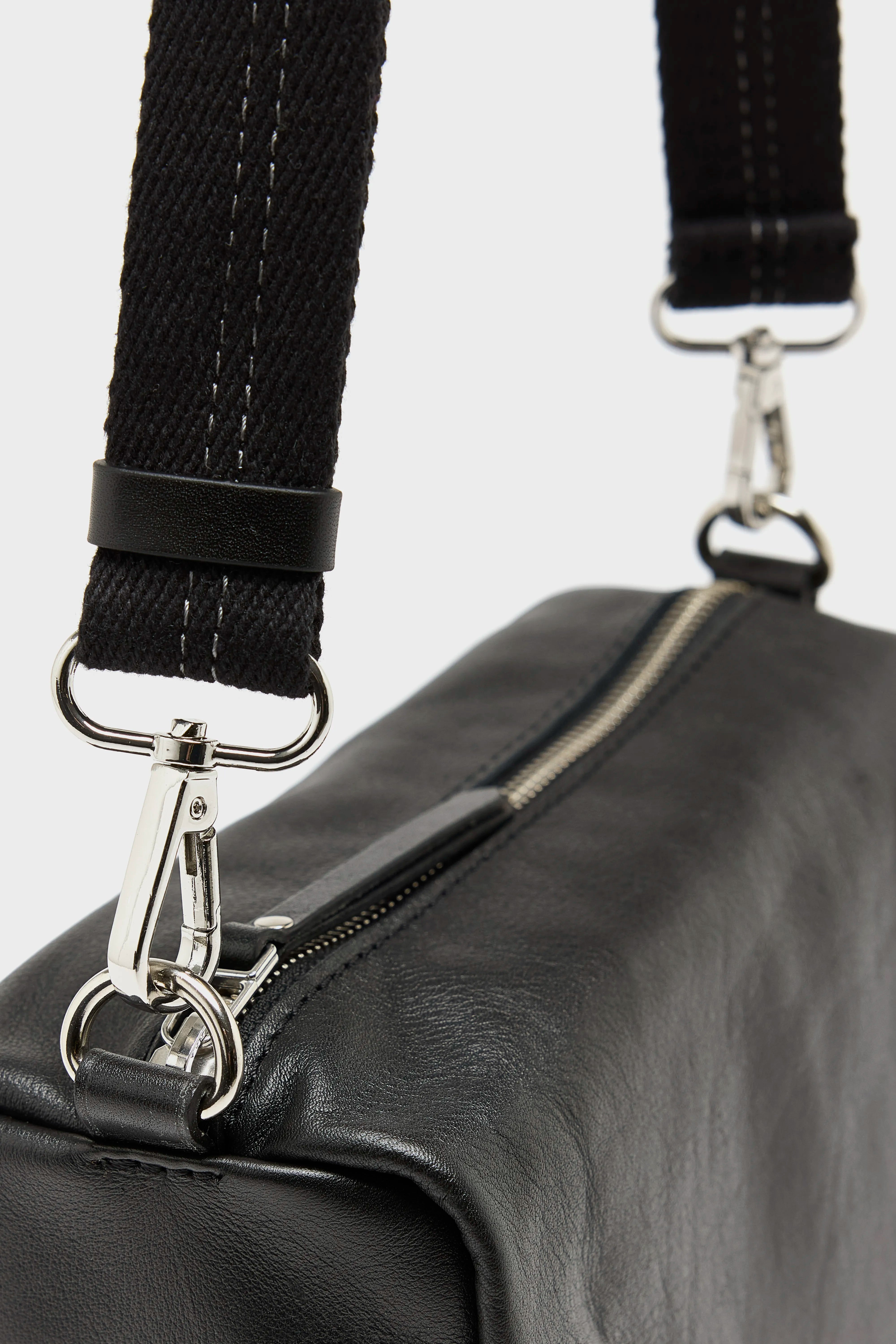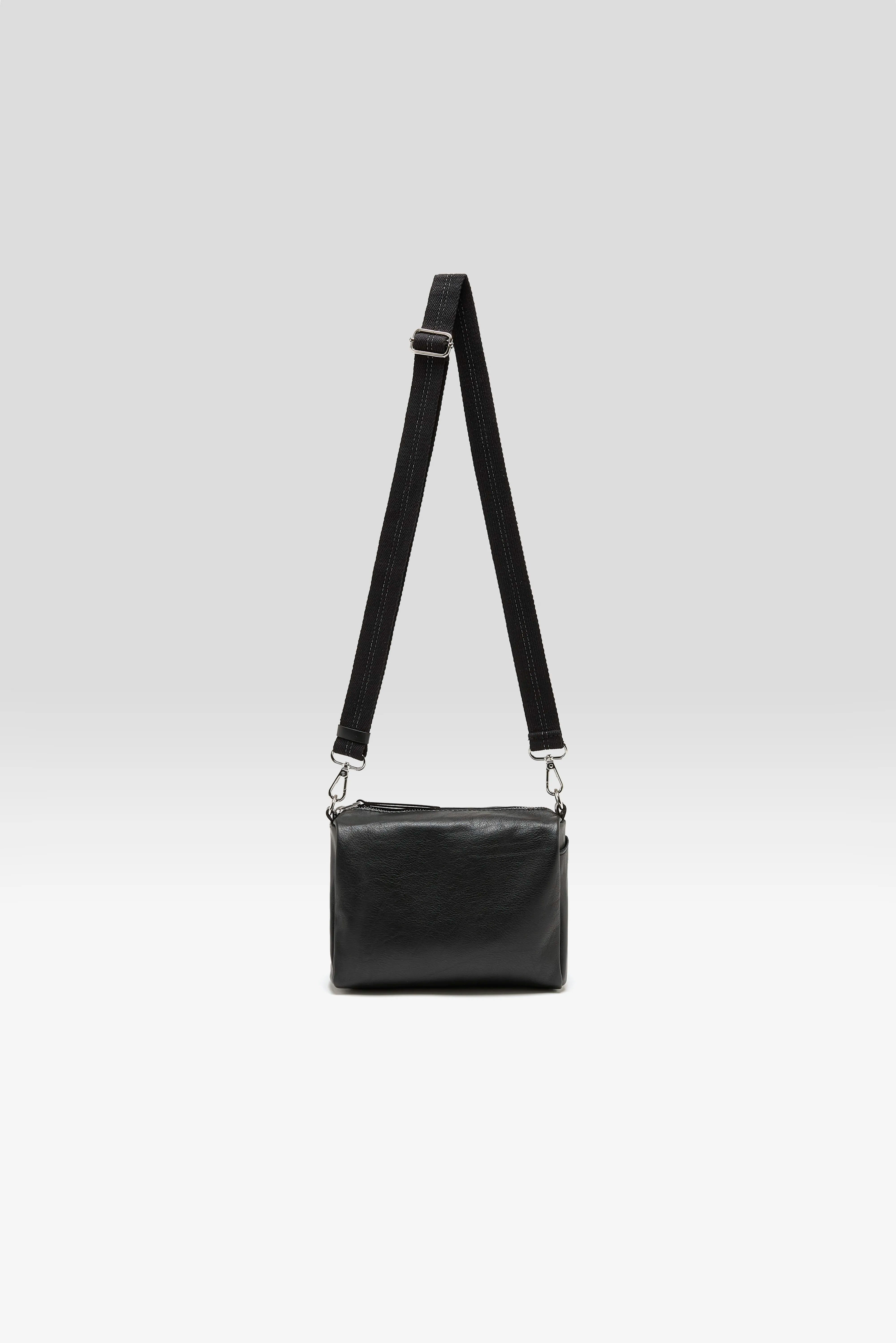 Supple box bag with zip top closure and side pocket made from grainy black leather.