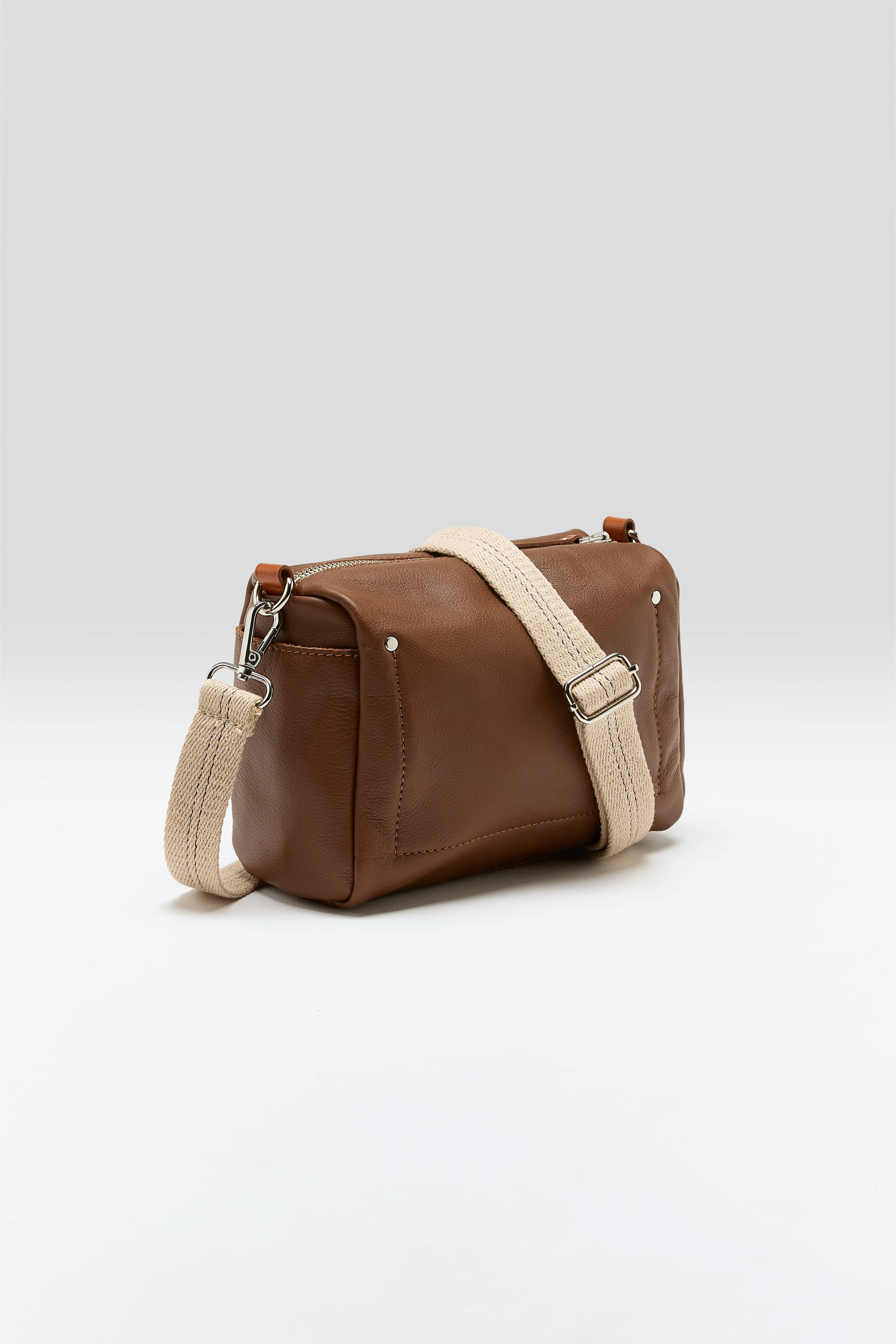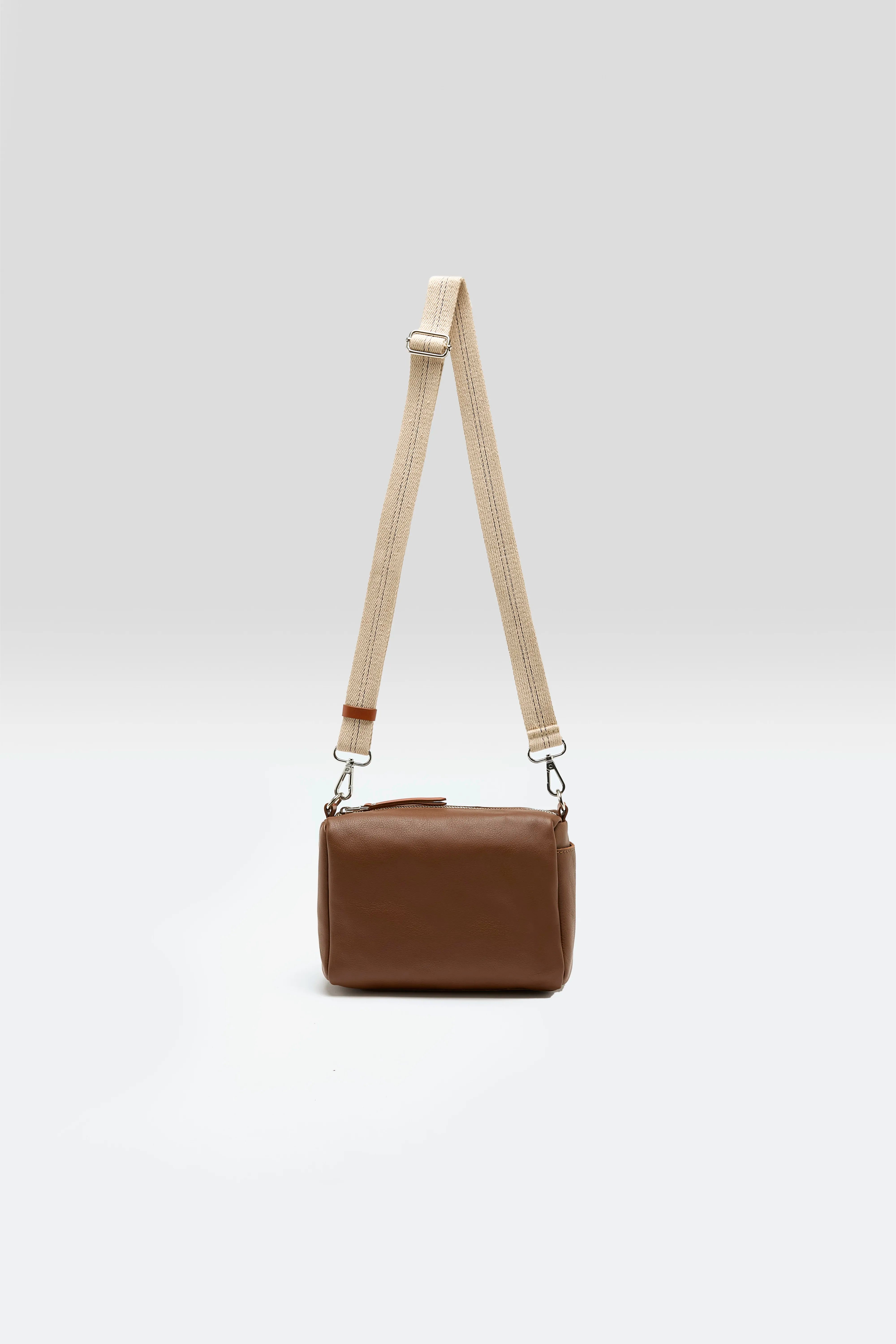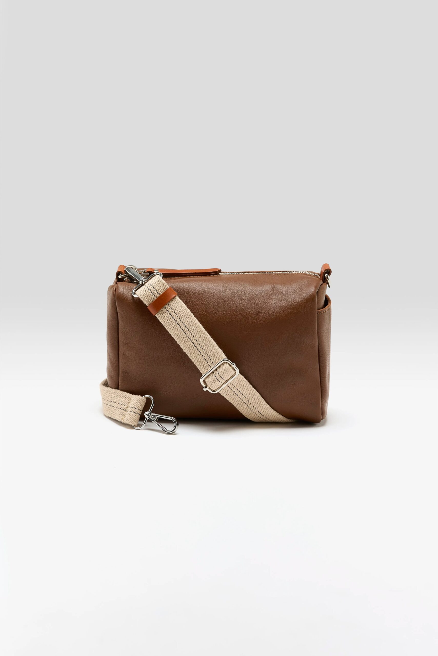 Supple box bag with zip top closure and side pocket made from grainy cognac leather.