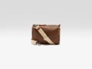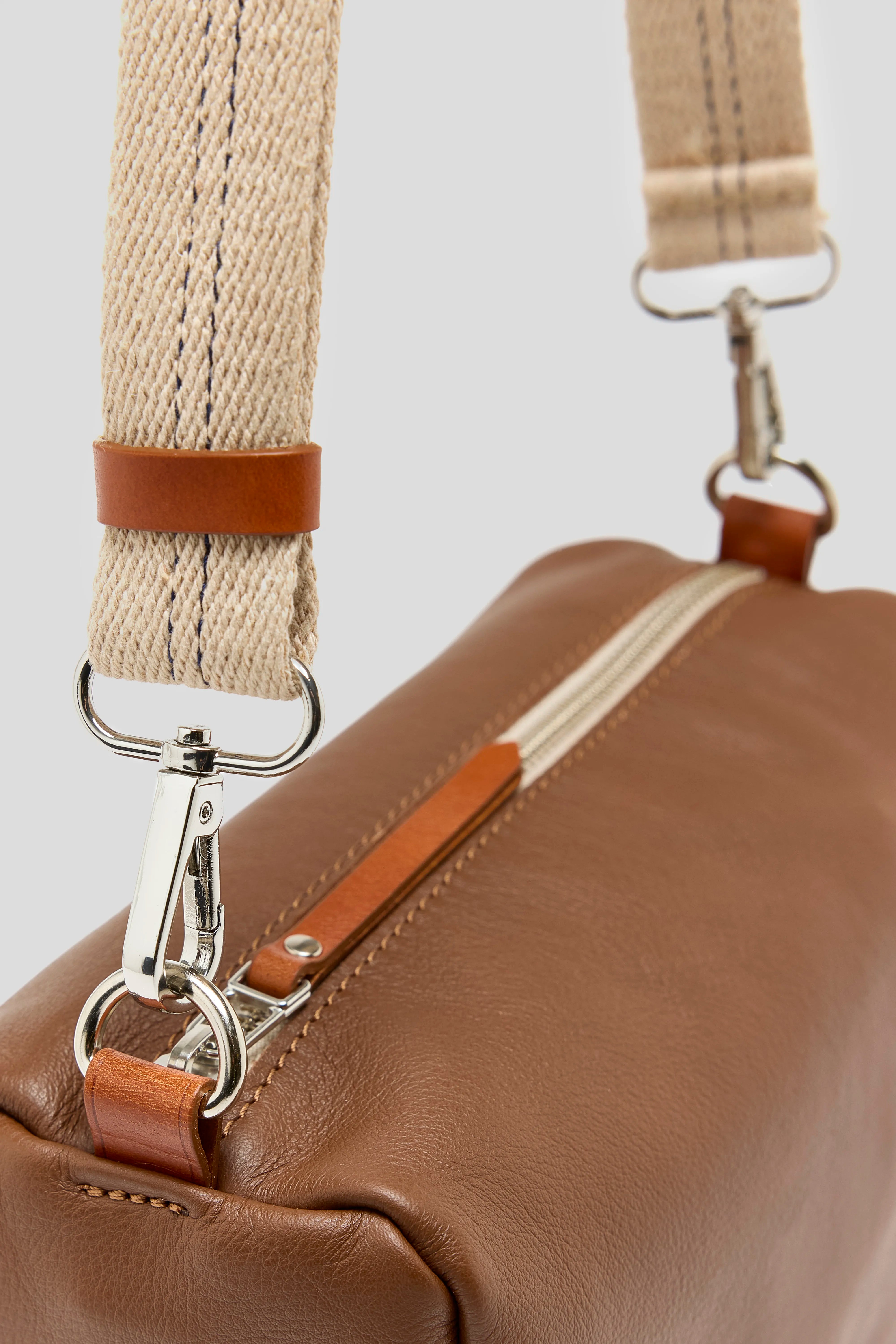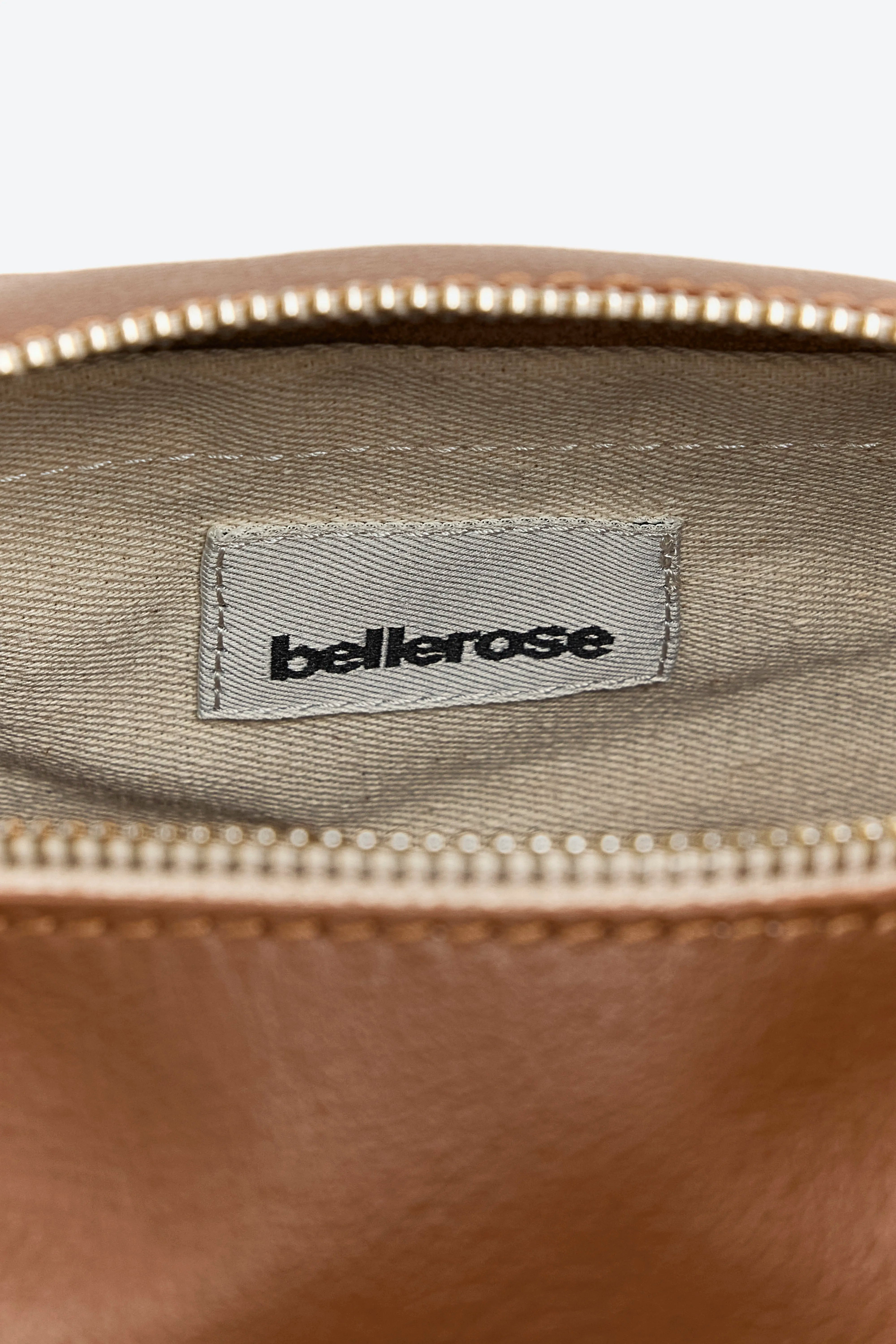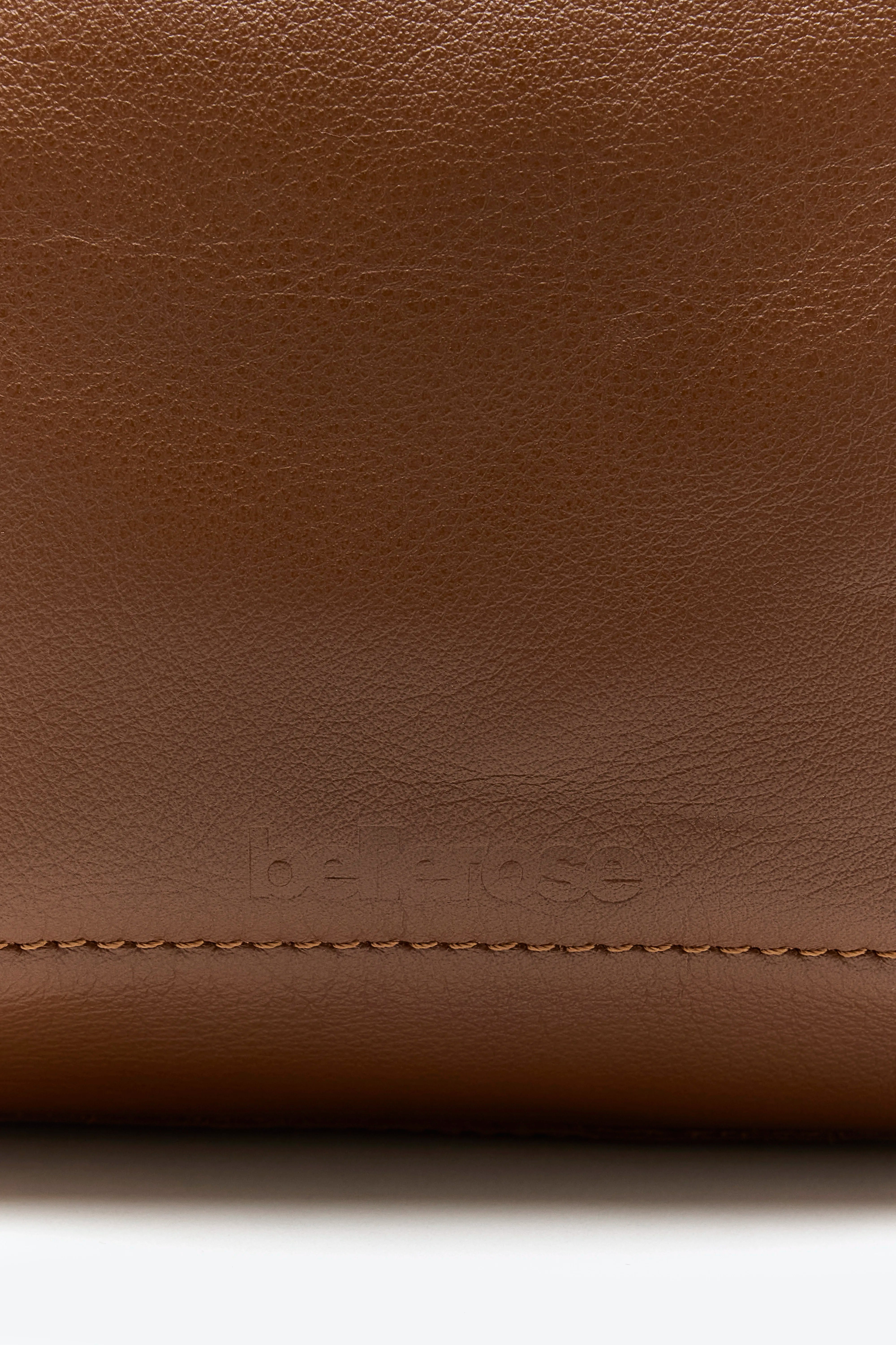 Supple box bag with zip top closure and side pocket made from grainy cognac leather.