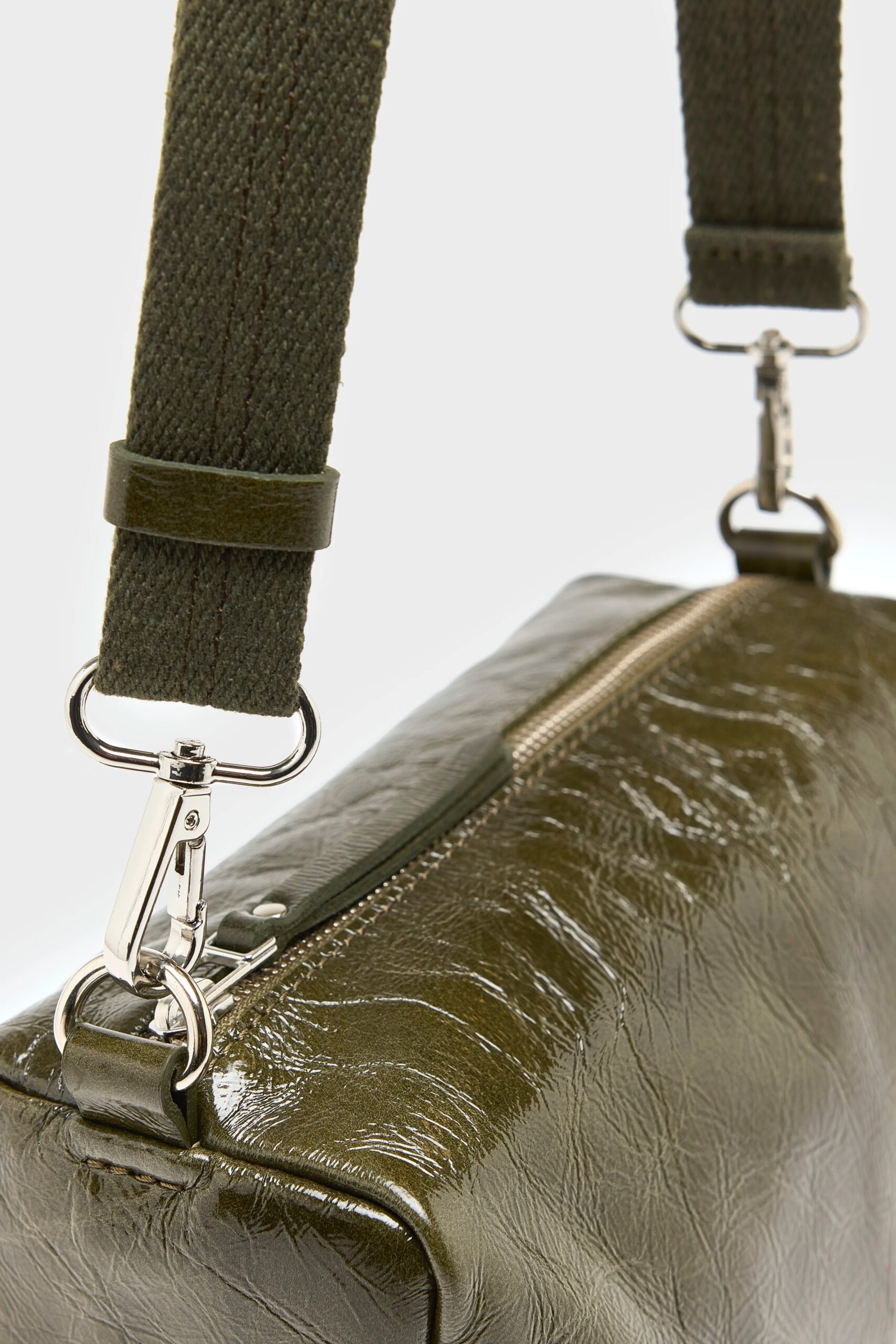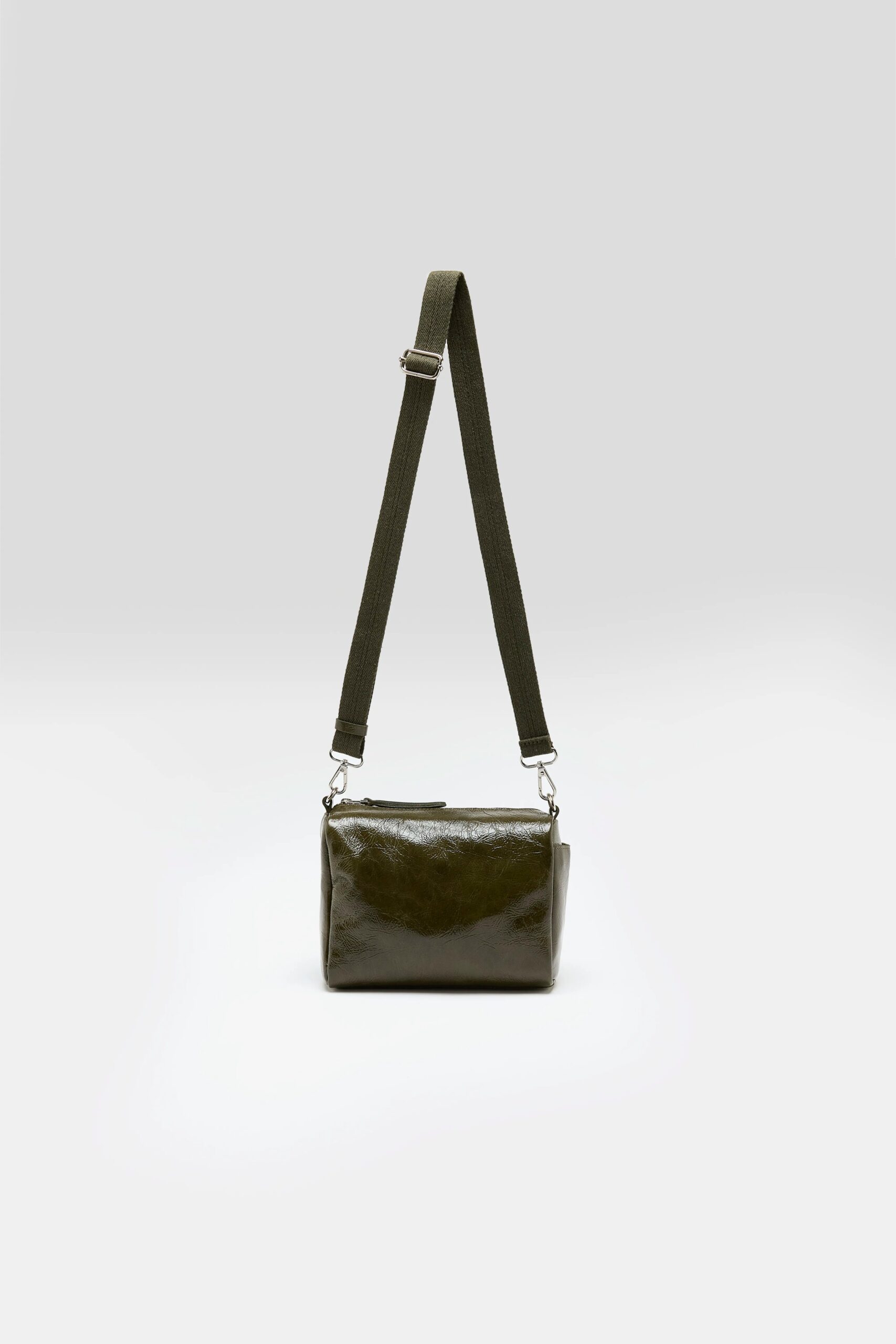 Supple box bag with zip top closure and side pocket made from glossy dark green leather.