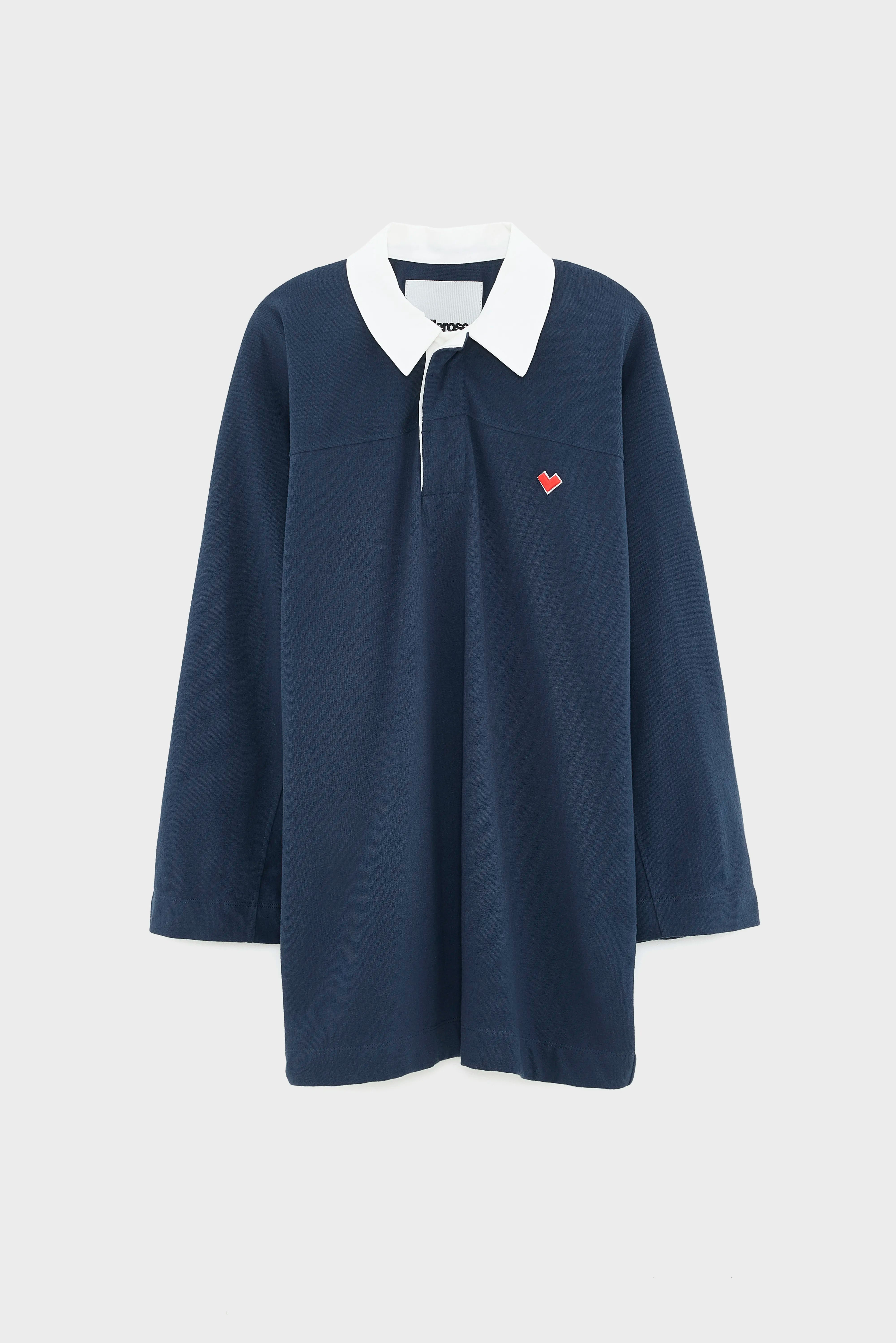 Oversized rugby-style dress in navy blue with a classic white collar.