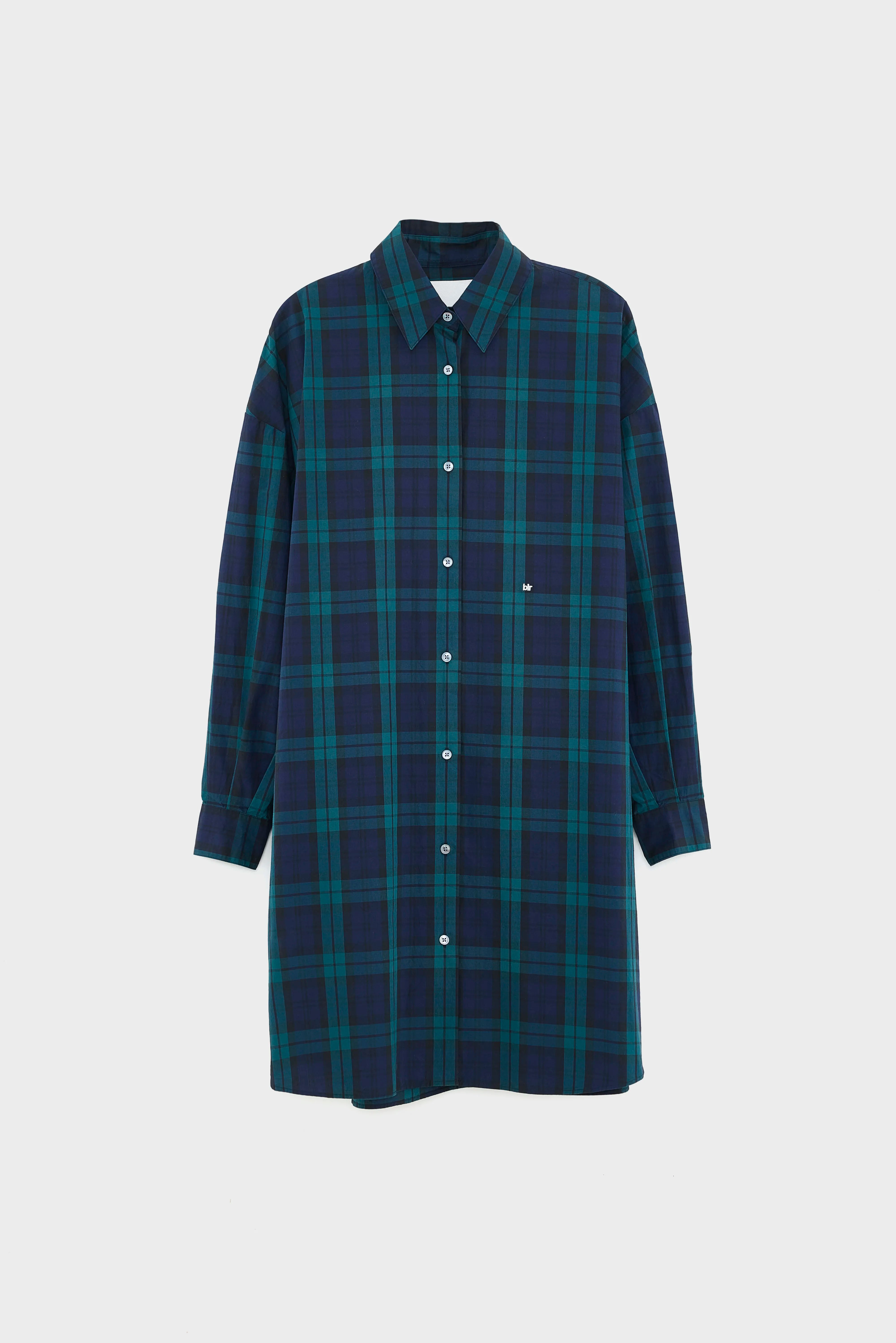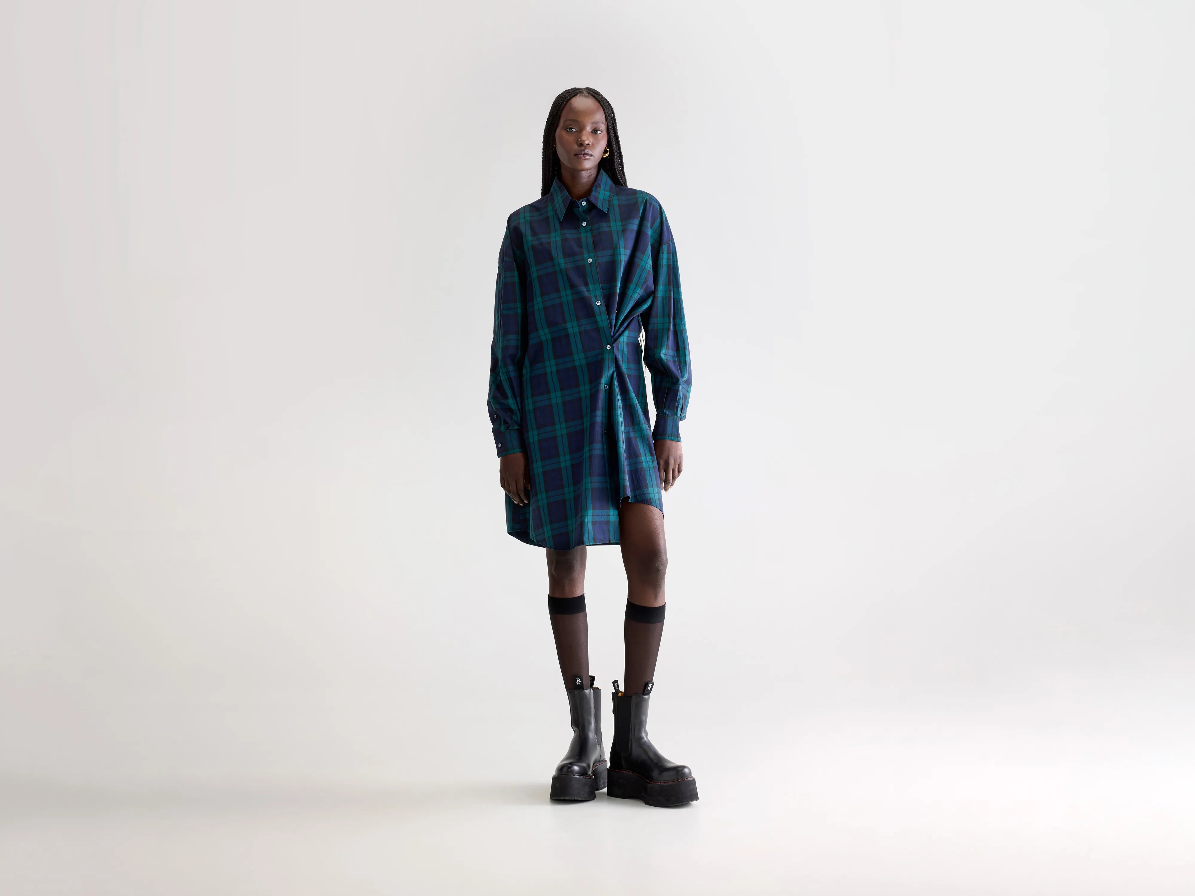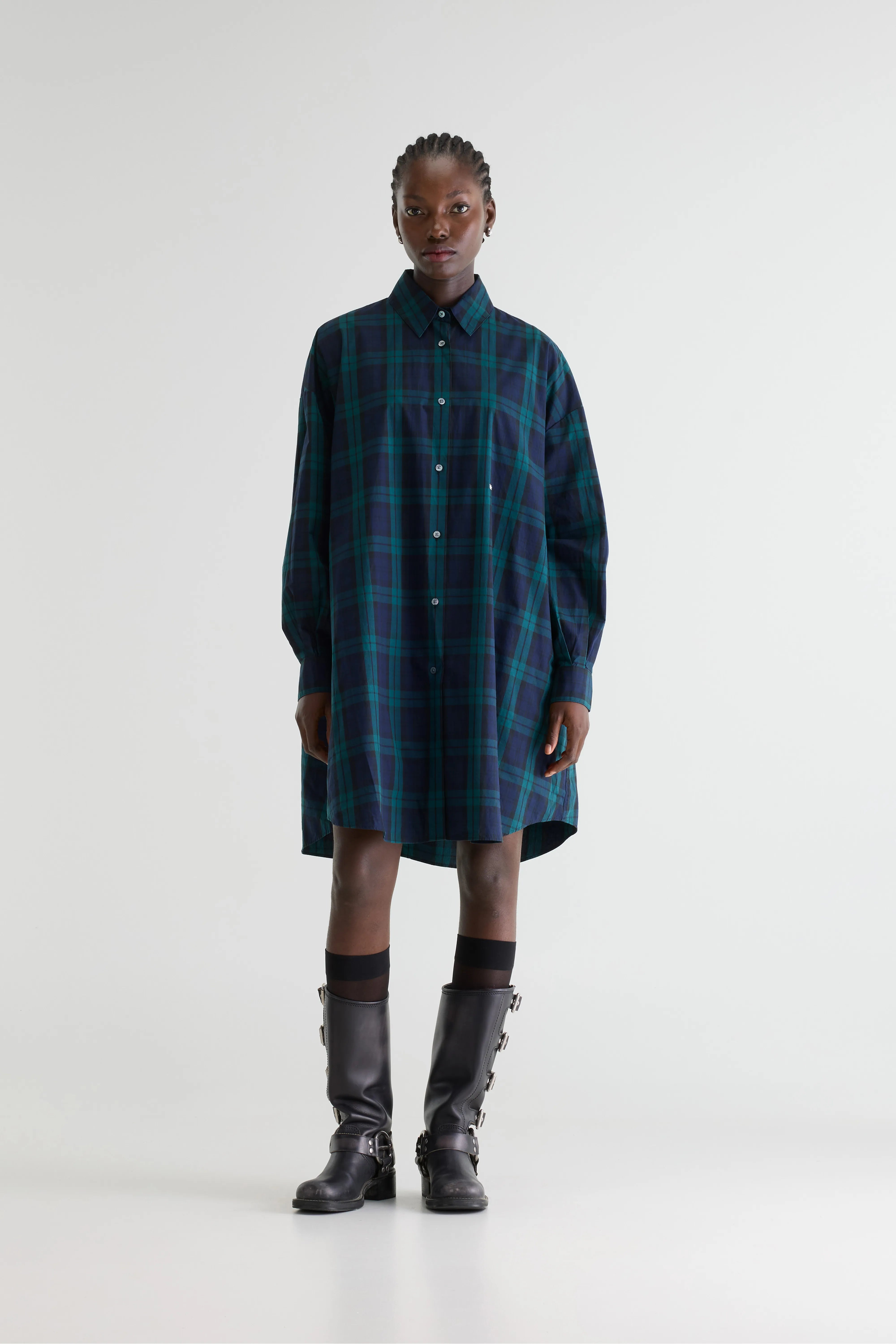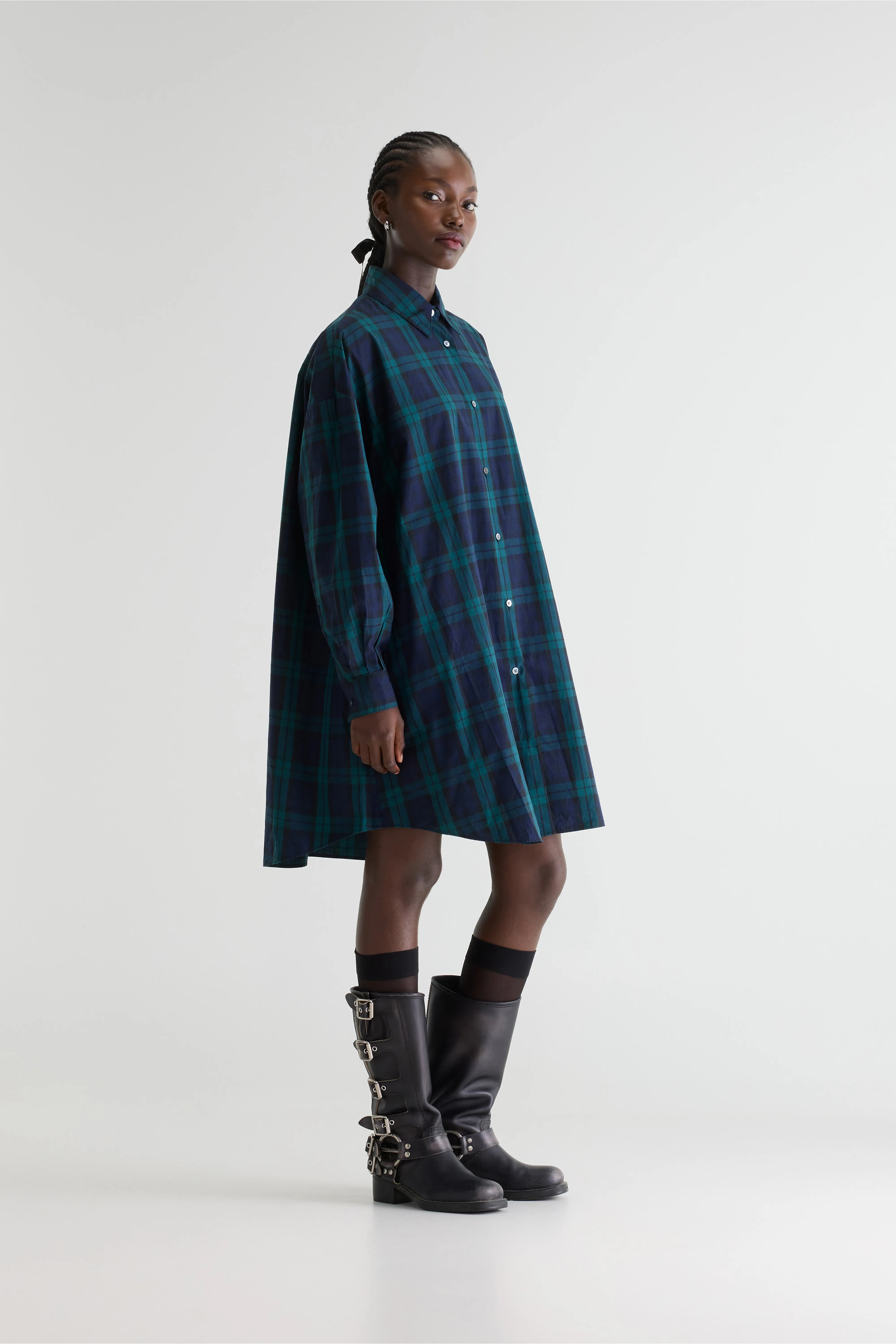 Oversized checkered shirt dress in deep green and navy with adjustable button detailing for a customisable fit.