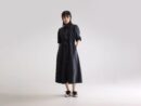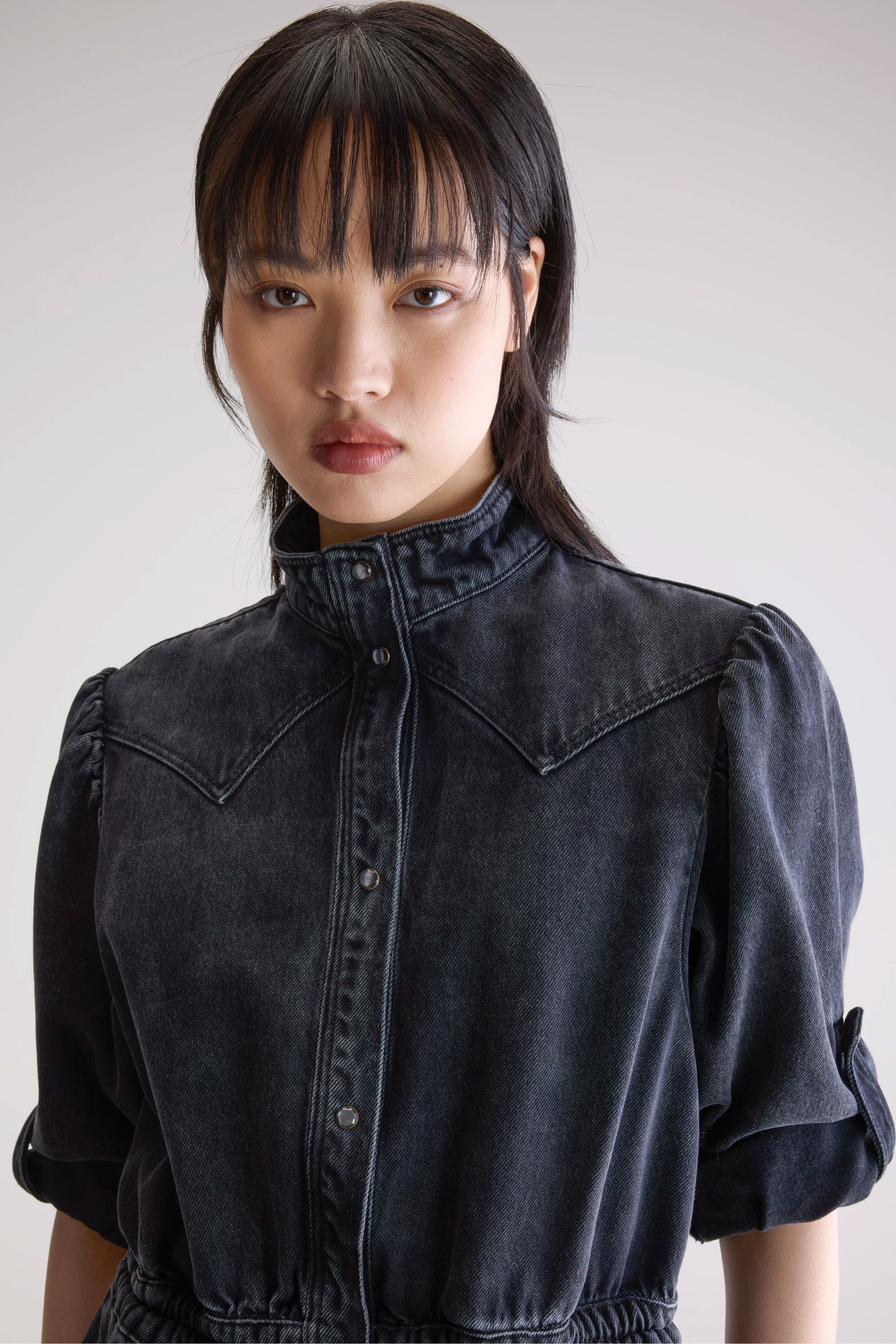 Western inspired denim midi dress with a raised collar. long sleeves that can be adapted with a roll-strap and a snap-button front. made from cotton denim in vintage black.