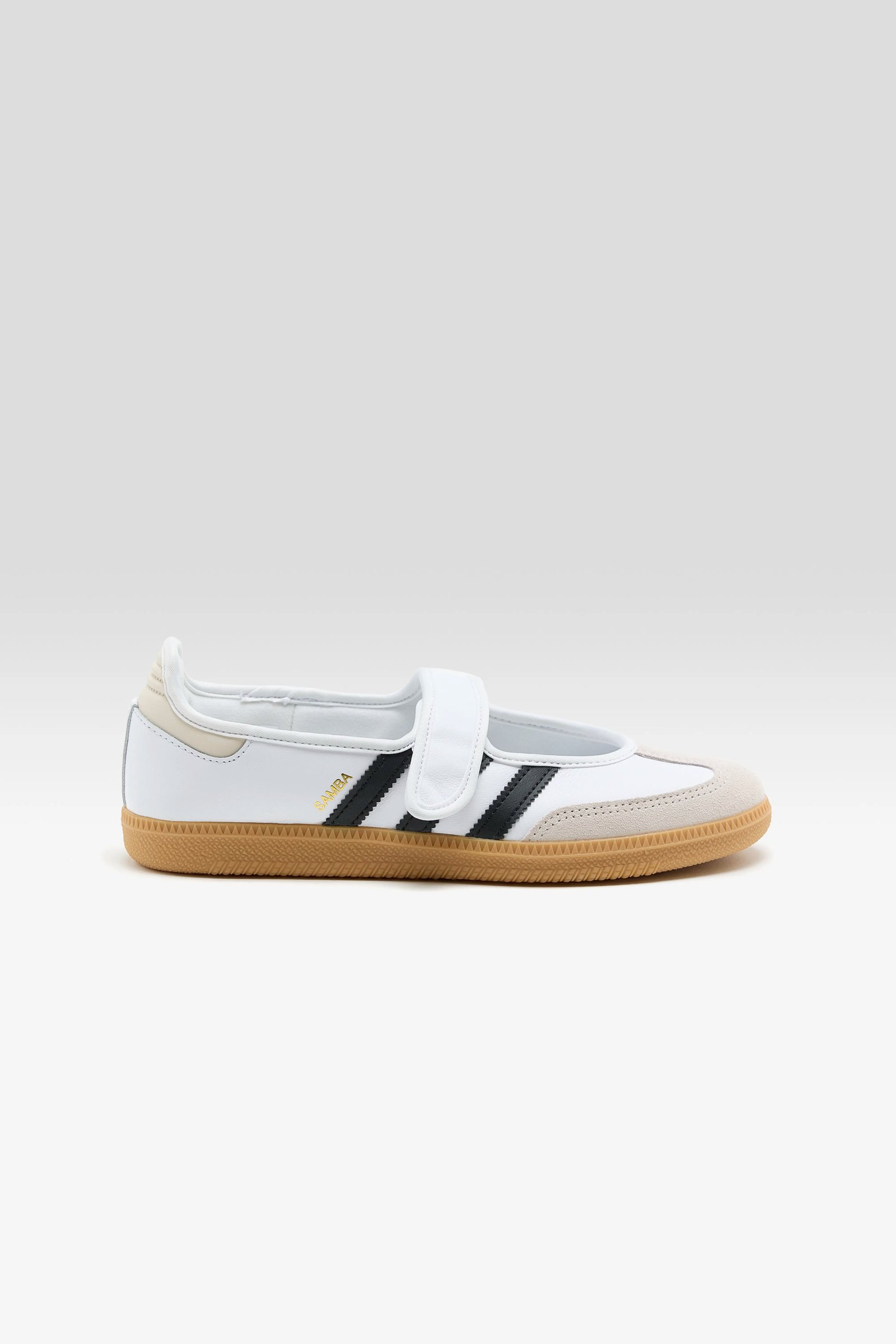 The Adidas Samba Jane shoes feature a smooth leather upper in a classic Mary Jane silhouette with a suede T-toe. a satin lining. and a grippy gum rubber outsole.
