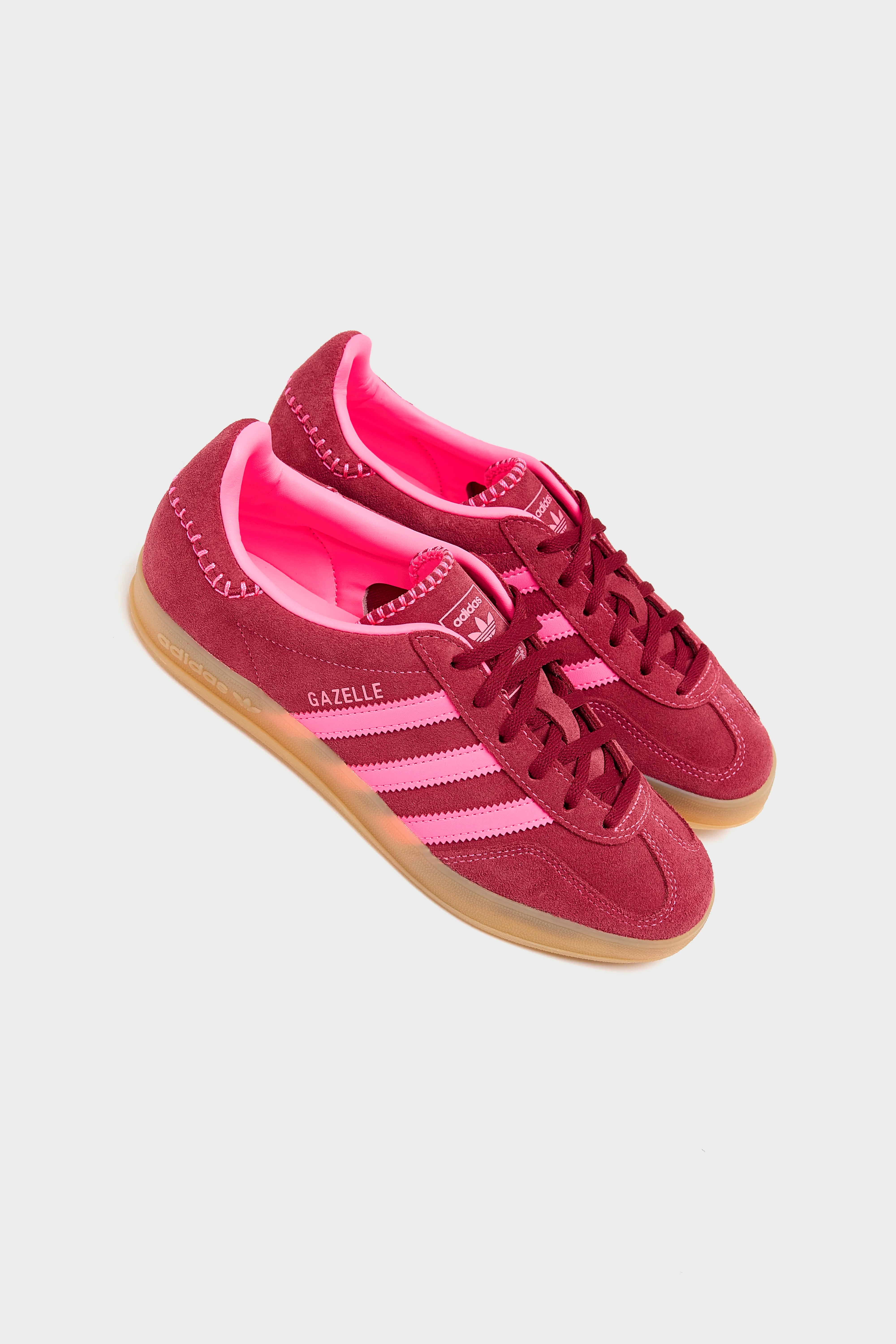 The Adidas Gazelle Indoor sneakers feature a low-cut profile with a suede upper and contrast stitching set on a gum rubber cupsole.